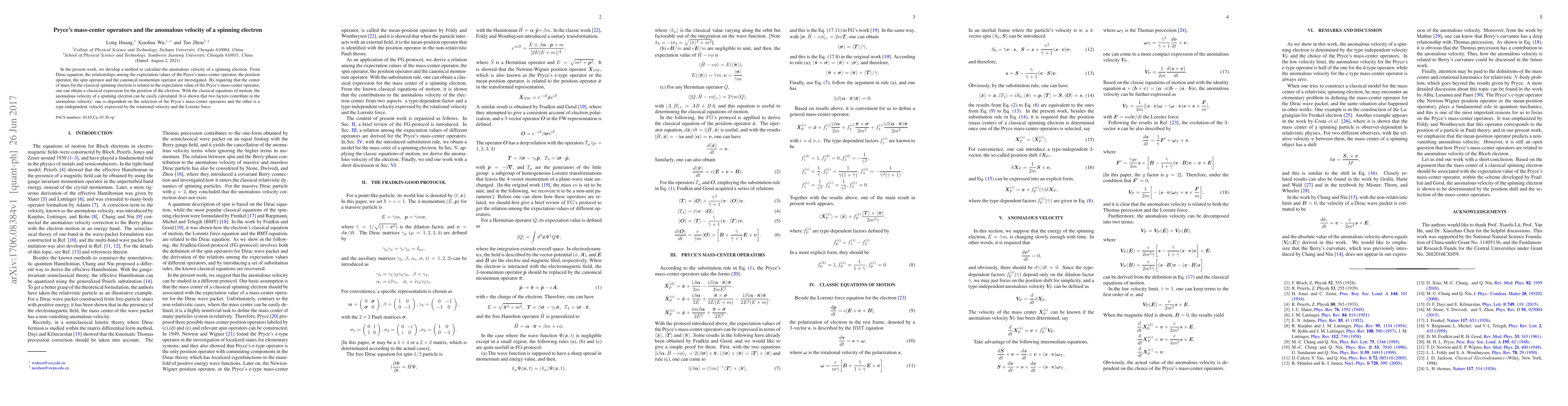This paper develops a method to calculate the anomalous velocity of a spinning electron using Pryce's mass-center operators. It derives classical expressions for the electron's position from the expectation values of these operators and finds that the anomalous velocity is influenced by both the choice of mass-center operators and a type-independent velocity involving rotational velocity and Lorentz force.