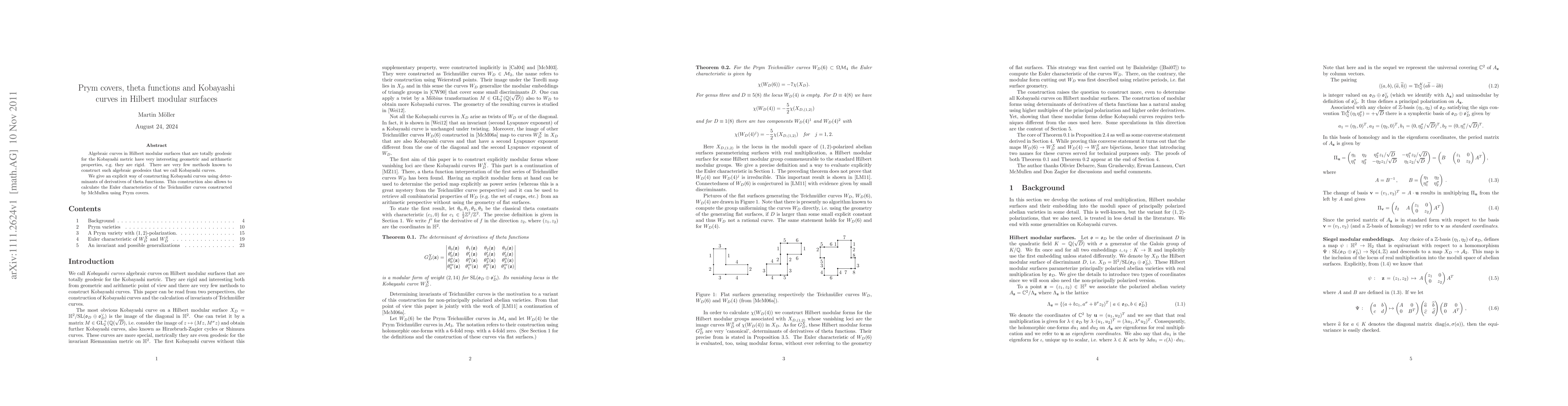 This paper presents a method to construct Kobayashi curves in Hilbert modular surfaces using determinants of derivatives of theta functions, revealing their rigidity and enabling the calculation of Euler characteristics of Teichmüller curves via Prym covers.