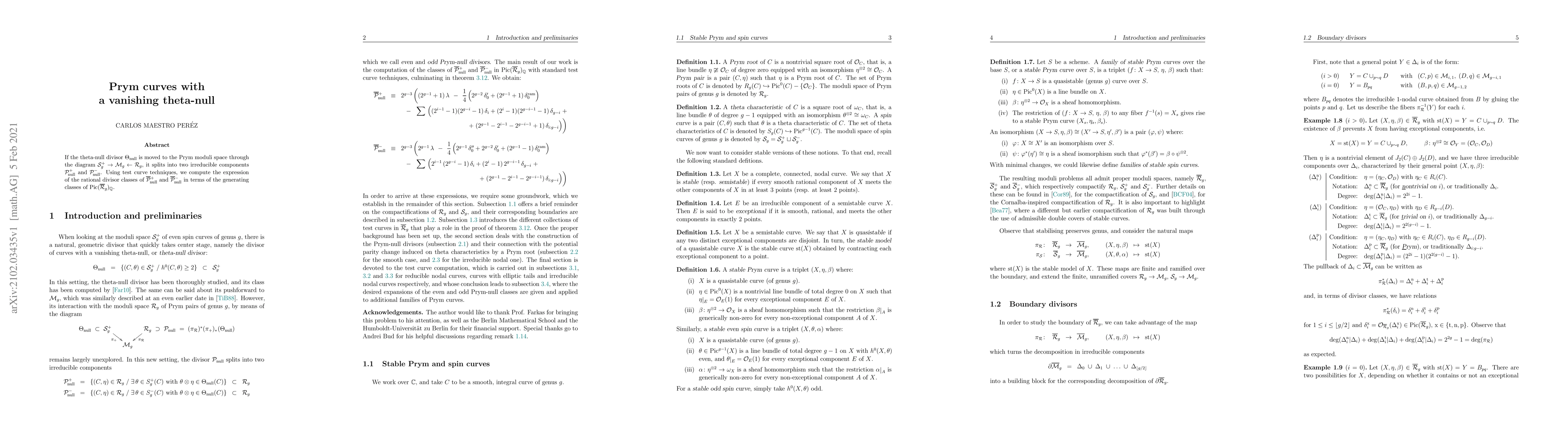 If the theta-null divisor $\Theta_{\rm null}$ is moved to the Prym moduli space through the diagram $\mathcal{S}_{g}^{+}\rightarrow\mathcal{M}_{g}\leftarrow\mathcal{R}_{g}$, it splits into two irreducible components $\mathcal{P}_{\rm\! null}^{+}$ and $\mathcal{P}_{\rm\! null}^{-}$. Using test curve techniques, we compute the class of the closure of each of these components in terms of the generating classes of $\mathrm{Pic}(\overline{\mathcal{R}}_{g})_{\mathbb{Q}}$.