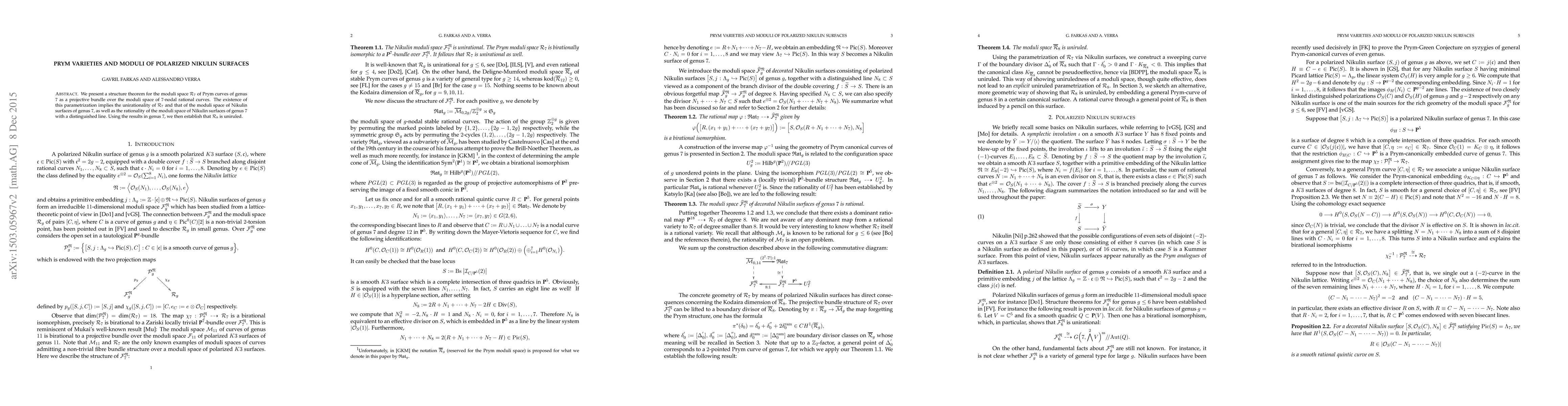 We present a structure theorem for the moduli space R_7 of Prym curves of genus 7 as a projective bundle over the moduli space of 7-nodal rational curves. The existence of this parametrization implies the unirationality of R_7 and that of the moduli space of Nikulin surfaces of genus 7, as well as the rationality of the moduli space of Nikulin surfaces of genus 7 with a distinguished line. Using the results in genus 7, we then establish that R_8 is uniruled.