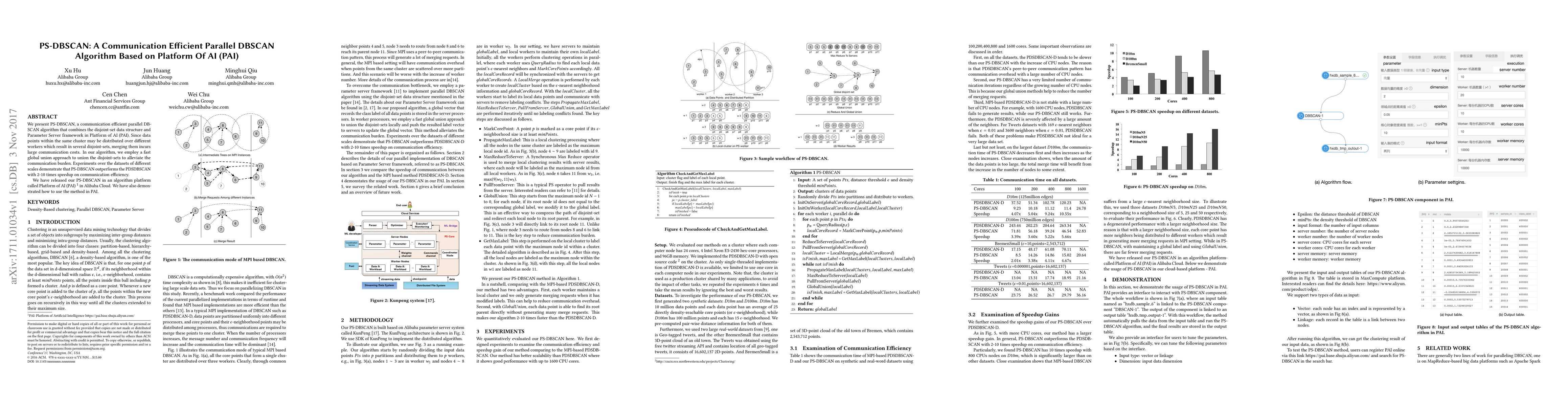 PS-DBSCAN is a parallel DBSCAN algorithm that leverages the Platform of AI (PAI) to efficiently merge disjoint-set clusters, significantly reducing communication costs. Experiments show a 2-10 times speedup in communication efficiency compared to PDSDBSCAN.