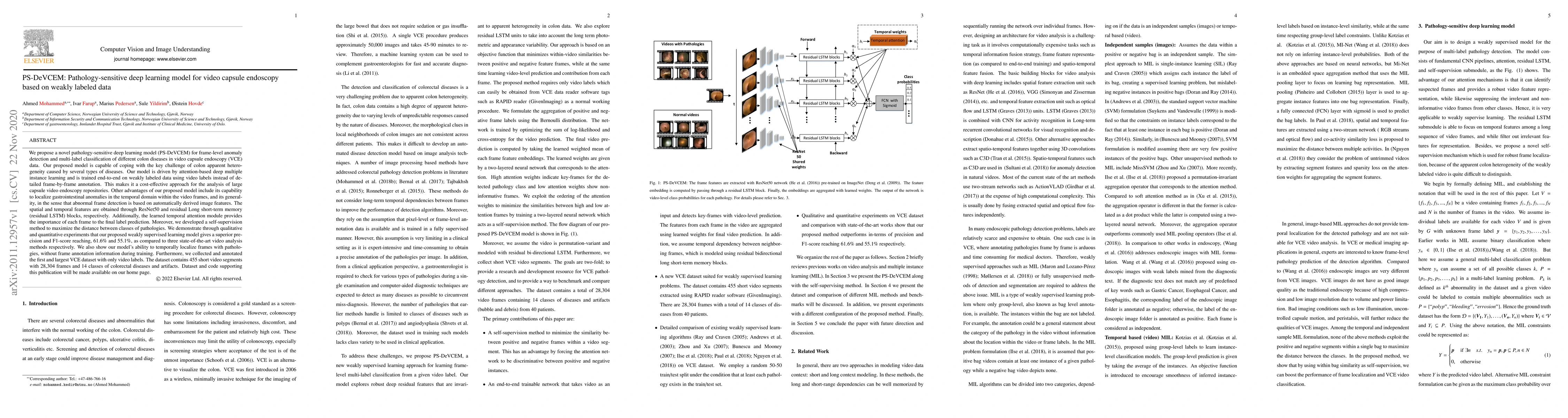 We propose a novel pathology-sensitive deep learning model (PS-DeVCEM) for frame-level anomaly detection and multi-label classification of different colon diseases in video capsule endoscopy (VCE) data. Our proposed model is capable of coping with the key challenge of colon apparent heterogeneity caused by several types of diseases. Our model is driven by attention-based deep multiple instance learning and is trained end-to-end on weakly labeled data using video labels instead of detailed frame-by-frame annotation. The spatial and temporal features are obtained through ResNet50 and residual Long short-term memory (residual LSTM) blocks, respectively. Additionally, the learned temporal attention module provides the importance of each frame to the final label prediction. Moreover, we developed a self-supervision method to maximize the distance between classes of pathologies. We demonstrate through qualitative and quantitative experiments that our proposed weakly supervised learning model gives superior precision and F1-score reaching, 61.6% and 55.1%, as compared to three state-of-the-art video analysis methods respectively. We also show our model's ability to temporally localize frames with pathologies, without frame annotation information during training. Furthermore, we collected and annotated the first and largest VCE dataset with only video labels. The dataset contains 455 short video segments with 28,304 frames and 14 classes of colorectal diseases and artifacts. Dataset and code supporting this publication will be made available on our home page.