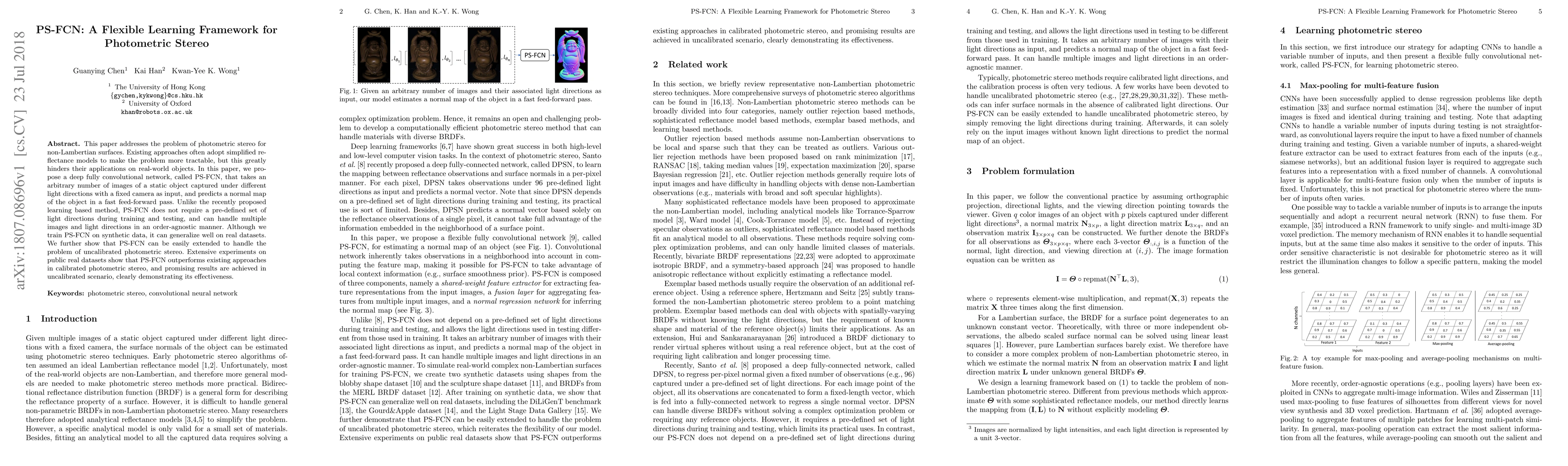 PS-FCN is a deep learning framework for photometric stereo that handles non-Lambertian surfaces without predefined light directions. It outperforms existing methods on both calibrated and uncalibrated photometric stereo tasks, demonstrating its flexibility and effectiveness.