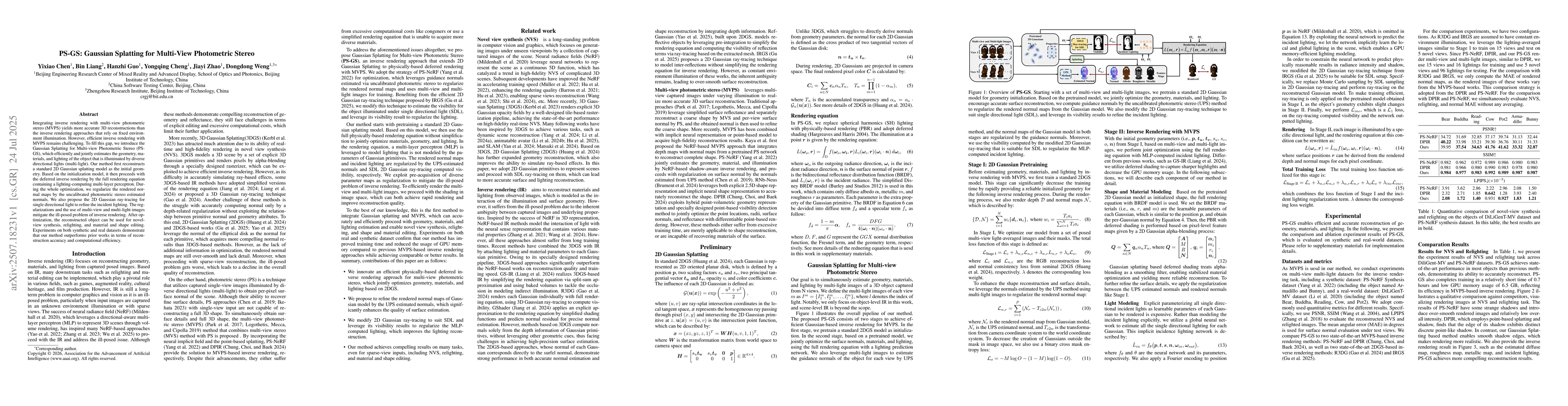Integrating inverse rendering with multi-view photometric stereo (MVPS) yields more accurate 3D reconstructions than the inverse rendering approaches that rely on fixed environment illumination. However, efficient inverse rendering with MVPS remains challenging. To fill this gap, we introduce the Gaussian Splatting for Multi-view Photometric Stereo (PS-GS), which efficiently and jointly estimates the geometry, materials, and lighting of the object that is illuminated by diverse directional lights (multi-light). Our method first reconstructs a standard 2D Gaussian splatting model as the initial geometry. Based on the initialization model, it then proceeds with the deferred inverse rendering by the full rendering equation containing a lighting-computing multi-layer perceptron. During the whole optimization, we regularize the rendered normal maps by the uncalibrated photometric stereo estimated normals. We also propose the 2D Gaussian ray-tracing for single directional light to refine the incident lighting. The regularizations and the use of multi-view and multi-light images mitigate the ill-posed problem of inverse rendering. After optimization, the reconstructed object can be used for novel-view synthesis, relighting, and material and shape editing. Experiments on both synthetic and real datasets demonstrate that our method outperforms prior works in terms of reconstruction accuracy and computational efficiency.