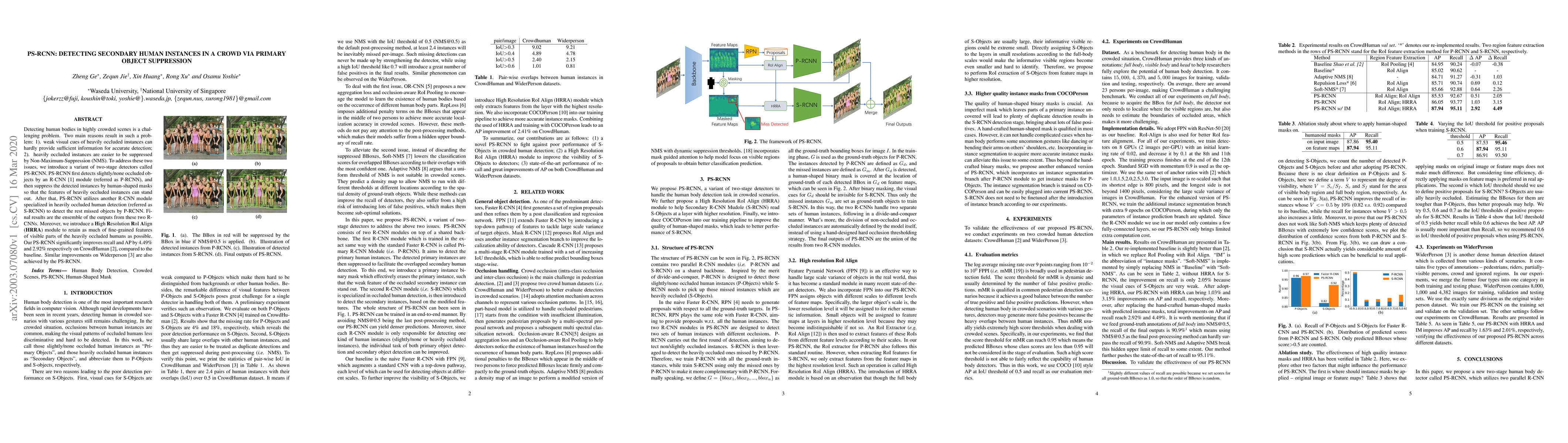 Detecting human bodies in highly crowded scenes is a challenging problem. Two main reasons result in such a problem: 1). weak visual cues of heavily occluded instances can hardly provide sufficient information for accurate detection; 2). heavily occluded instances are easier to be suppressed by Non-Maximum-Suppression (NMS). To address these two issues, we introduce a variant of two-stage detectors called PS-RCNN. PS-RCNN first detects slightly/none occluded objects by an R-CNN module (referred as P-RCNN), and then suppress the detected instances by human-shaped masks so that the features of heavily occluded instances can stand out. After that, PS-RCNN utilizes another R-CNN module specialized in heavily occluded human detection (referred as S-RCNN) to detect the rest missed objects by P-RCNN. Final results are the ensemble of the outputs from these two R-CNNs. Moreover, we introduce a High Resolution RoI Align (HRRA) module to retain as much of fine-grained features of visible parts of the heavily occluded humans as possible. Our PS-RCNN significantly improves recall and AP by 4.49% and 2.92% respectively on CrowdHuman, compared to the baseline. Similar improvements on Widerperson are also achieved by the PS-RCNN.