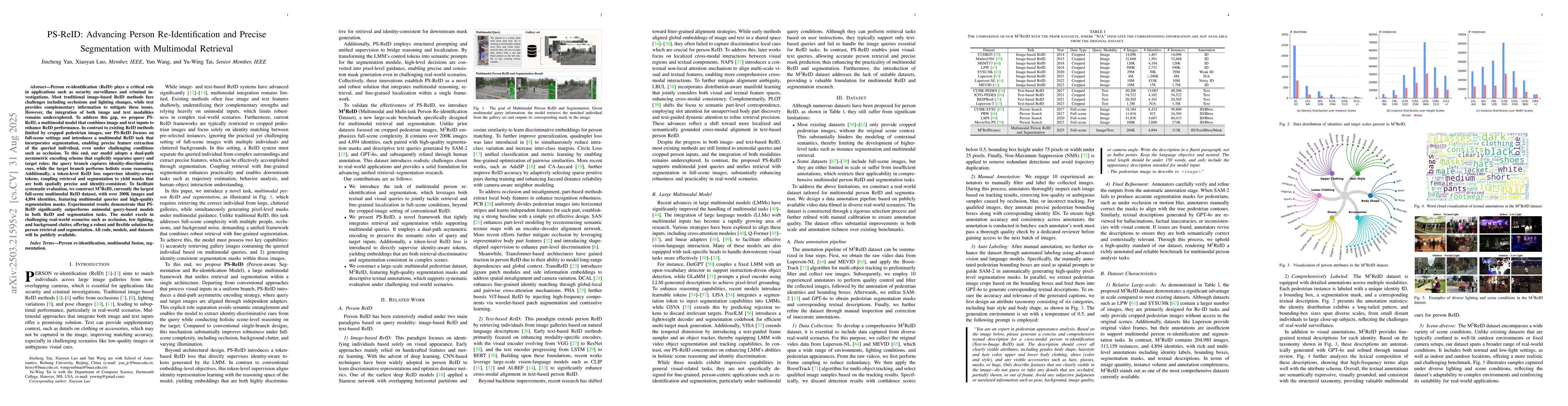 Person re-identification (ReID) plays a critical role in applications such as security surveillance and criminal investigations. Most traditional image-based ReID methods face challenges including occlusions and lighting changes, while text provides complementary information to mitigate these issues. However, the integration of both image and text modalities remains underexplored. To address this gap, we propose {\bf PS-ReID}, a multimodal model that combines image and text inputs to enhance ReID performance. In contrast to existing ReID methods limited by cropped pedestrian images, our PS-ReID focuses on full-scene settings and introduces a multimodal ReID task that incorporates segmentation, enabling precise feature extraction of the queried individual, even under challenging conditions such as occlusion. To this end, our model adopts a dual-path asymmetric encoding scheme that explicitly separates query and target roles: the query branch captures identity-discriminative cues, while the target branch performs holistic scene reasoning. Additionally, a token-level ReID loss supervises identity-aware tokens, coupling retrieval and segmentation to yield masks that are both spatially precise and identity-consistent. To facilitate systematic evaluation, we construct M2ReID, currently the largest full-scene multimodal ReID dataset, with over 200K images and 4,894 identities, featuring multimodal queries and high-quality segmentation masks. Experimental results demonstrate that PS-ReID significantly outperforms unimodal query-based models in both ReID and segmentation tasks. The model excels in challenging real-world scenarios such as occlusion, low lighting, and background clutter, offering a robust and flexible solution for person retrieval and segmentation. All code, models, and datasets will be publicly available.