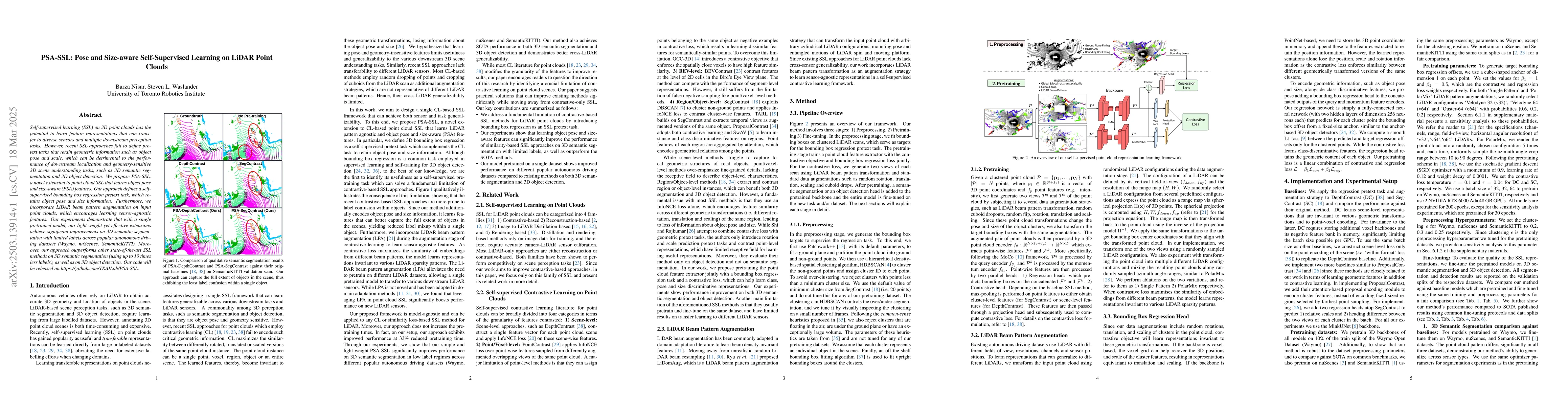 The paper proposes PSA-SSL, a self-supervised learning method for 3D LiDAR point clouds that retains object pose and size information through a bounding box regression pretext task and LiDAR beam pattern augmentation. This approach significantly improves 3D semantic segmentation and object detection with minimal labeled data.