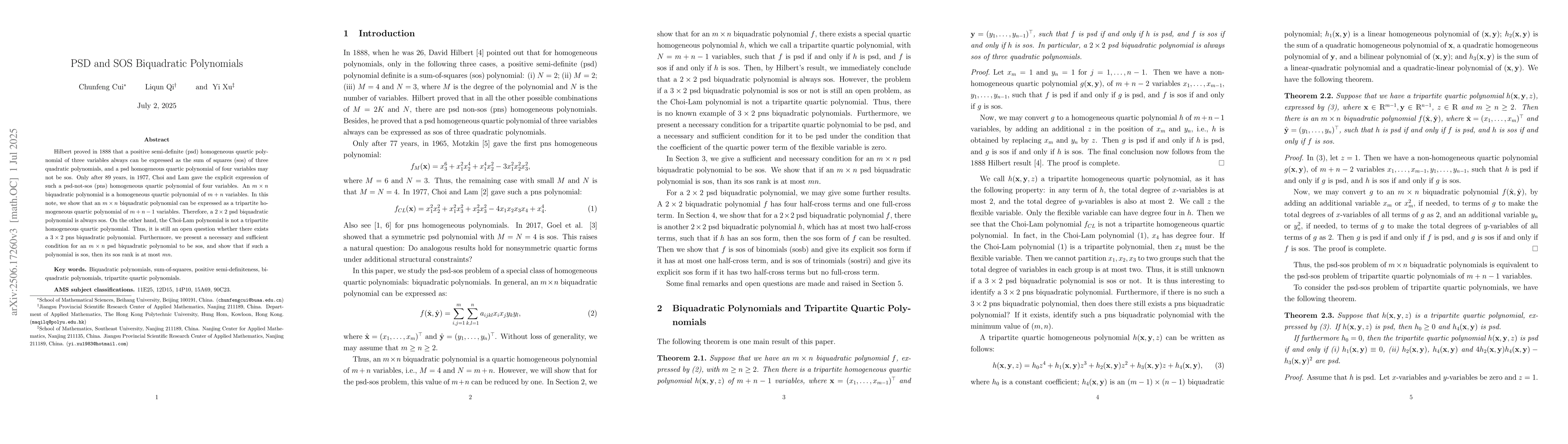 Hilbert indicated that a positive semi-definite (psd) homogeneous quartic polynomial of four variables may not be sum of squares (sos). {Since a} $2 \times 2$ biquadratic polynomial is a homogeneous quartic polynomial of four variables{, this raises a fundamental question:} Is a psd $2 \times 2$ biquadratic polynomial sos? In this paper, we present a necessary and sufficient condition for a $2 \times 2$ psd biquadratic polynomial to be sos. We show that if a $2 \times 2$ {psd} biquadratic polynomial is sos, then it is sos of tetranomials, its sos rank is at most $4$, and the coefficients of the tetranomials can be orthogonal to each other. We prove that every psd $2\times 2$ biquadratic polynomial admits an equivalent representation with two neighbor half-cross terms and one full-cross term. Furthermore, any $2 \times 2$ psd biquadratic polynomial is a sum of squares of binomials (sosb) when it contains at most one half-cross term, and a sum of squares of trinomials (sostri) when it contains exactly two neighbor half-cross terms and no full-cross term.