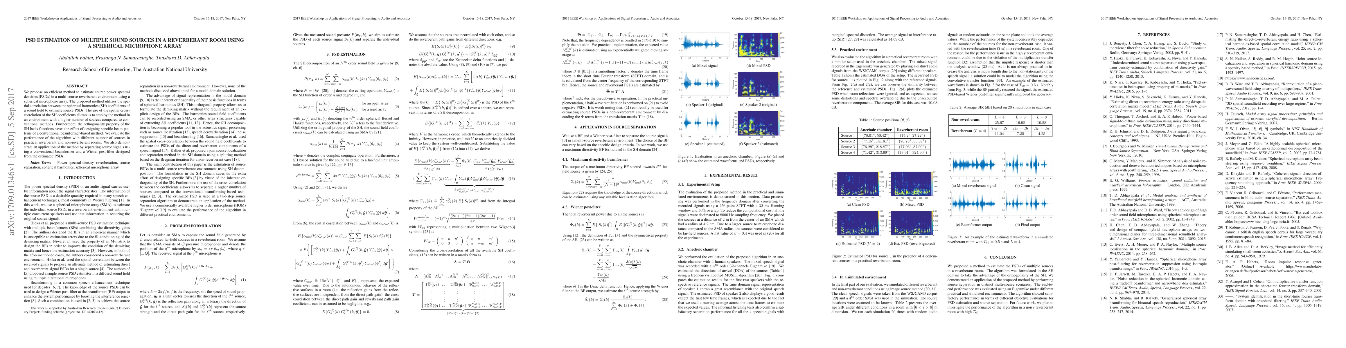 This paper proposes an efficient method for estimating source power spectral densities in reverberant environments using a spherical microphone array. The method leverages spatial correlation of spherical harmonics coefficients to handle multiple sound sources, offering advantages over conventional beamforming techniques.
