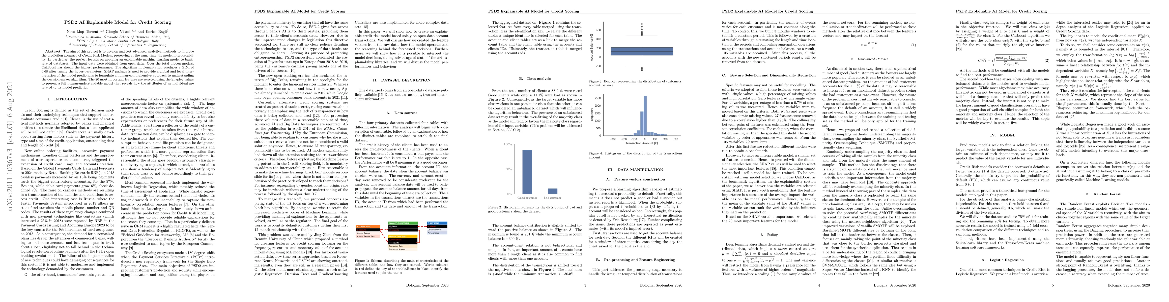 The aim of this project is to develop and test advanced analytical methods to improve the prediction accuracy of Credit Risk Models, preserving at the same time the model interpretability. In particular, the project focuses on applying an explainable machine learning model to bank-related databases. The input data were obtained from open data. Over the total proven models, CatBoost has shown the highest performance. The algorithm implementation produces a GINI of 0.68 after tuning the hyper-parameters. SHAP package is used to provide a global and local interpretation of the model predictions to formulate a human-comprehensive approach to understanding the decision-maker algorithm. The 20 most important features are selected using the Shapley values to present a full human-understandable model that reveals how the attributes of an individual are related to its model prediction.