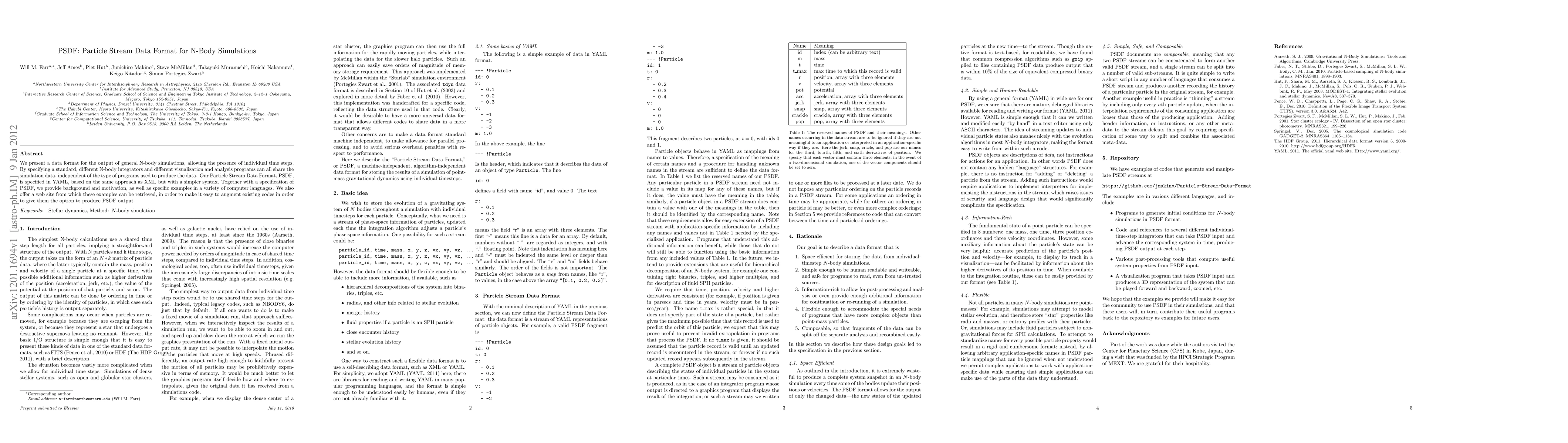 The PSDF (Particle Stream Data Format) is a standardized YAML-based data format for N-body simulation outputs, enabling different simulation and analysis tools to share data regardless of their origin. The format aims to simplify data interchange and is accompanied by examples and a dedicated website for easy integration.