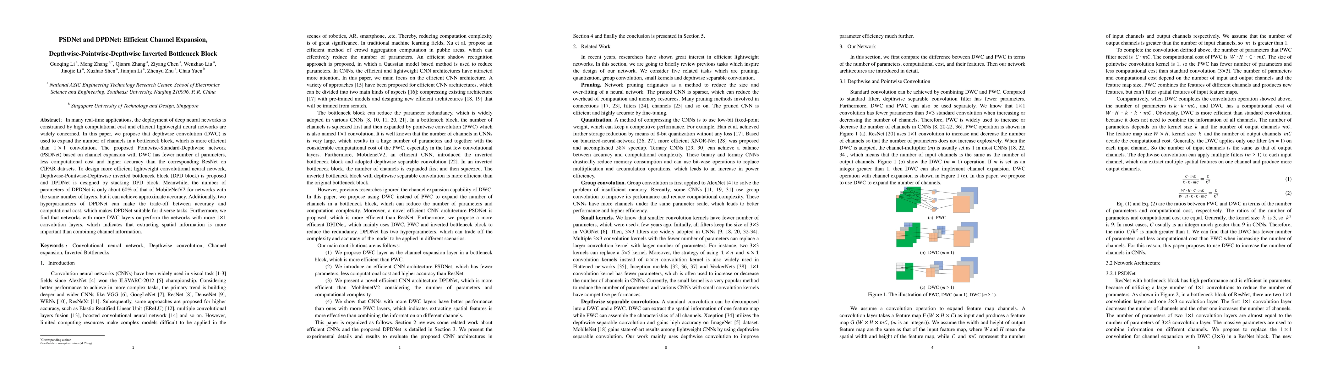 This paper proposes PSDNet and DPDNet, efficient lightweight neural networks using depthwise convolution for channel expansion in bottleneck blocks, achieving fewer parameters and lower computational costs while maintaining high accuracy compared to ResNet and MobileNetV2. The DPDNet design allows for a trade-off between accuracy and computational efficiency.