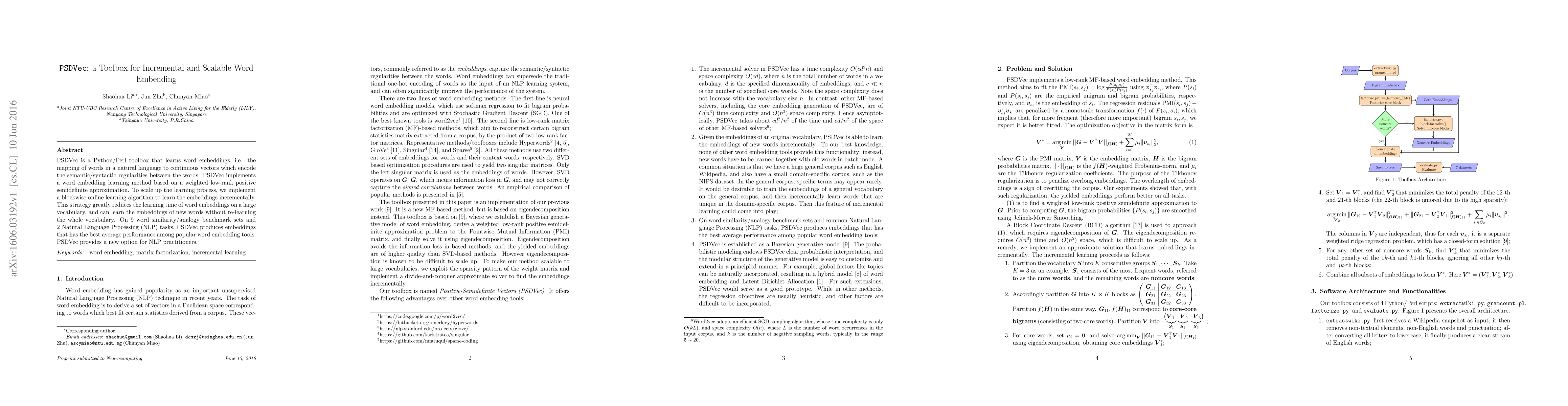 PSDVec is a Python/Perl toolbox that learns word embeddings, i.e. the mapping of words in a natural language to continuous vectors which encode the semantic/syntactic regularities between the words. PSDVec implements a word embedding learning method based on a weighted low-rank positive semidefinite approximation. To scale up the learning process, we implement a blockwise online learning algorithm to learn the embeddings incrementally. This strategy greatly reduces the learning time of word embeddings on a large vocabulary, and can learn the embeddings of new words without re-learning the whole vocabulary. On 9 word similarity/analogy benchmark sets and 2 Natural Language Processing (NLP) tasks, PSDVec produces embeddings that has the best average performance among popular word embedding tools. PSDVec provides a new option for NLP practitioners.