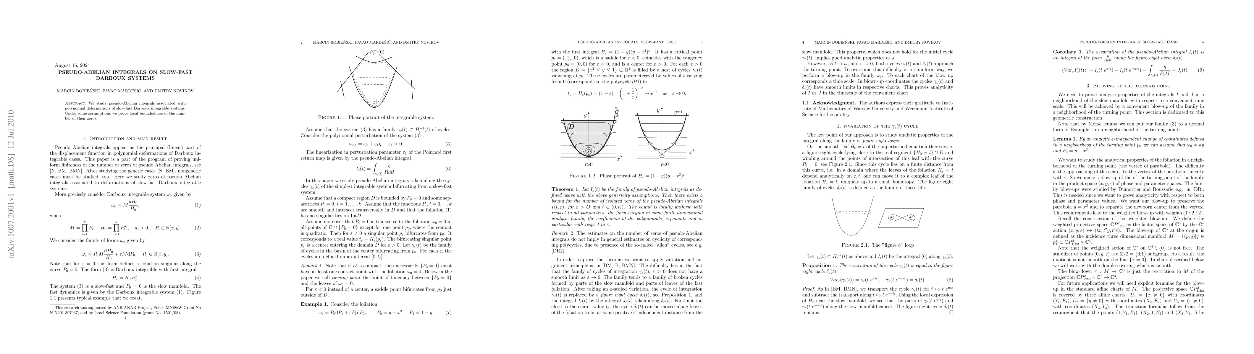 This paper investigates pseudo-Abelian integrals linked to polynomial deformations of slow-fast Darboux integrable systems, proving local boundedness of the number of zeros under certain assumptions.