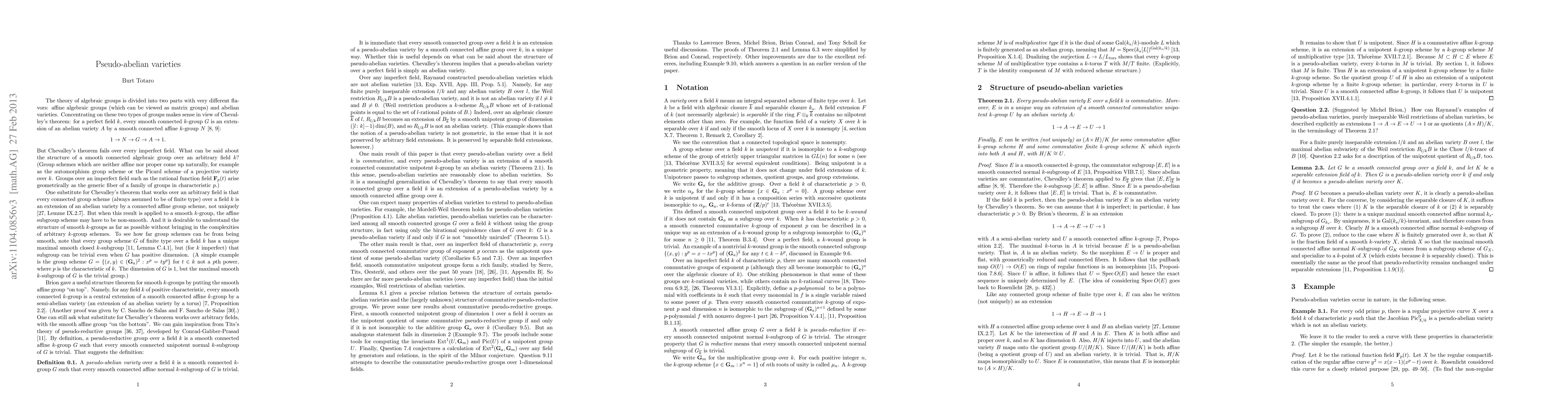 The definition and study of pseudo-abelian varieties over arbitrary fields, extending Chevalley's theorem and linking to unipotent and pseudo-reductive groups.