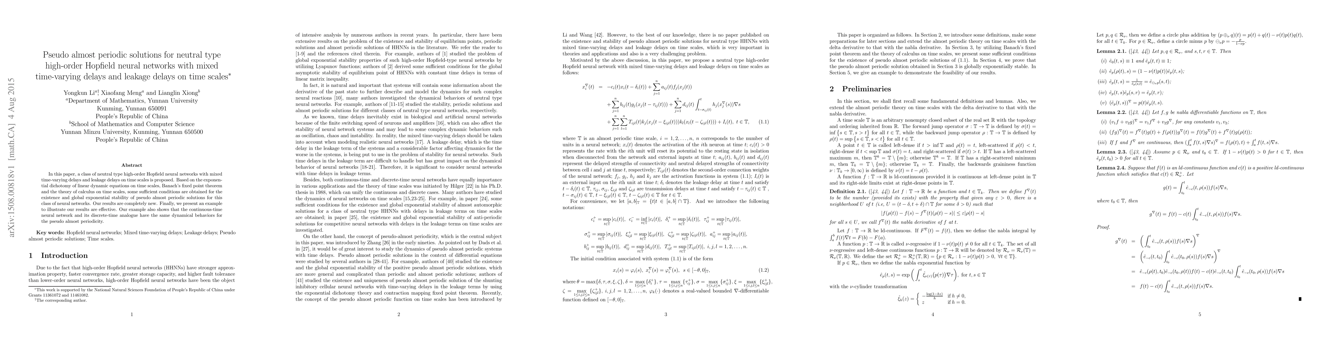 This paper proposes a class of neutral type high-order Hopfield neural networks with mixed time-varying delays and leakage delays on time scales. It establishes sufficient conditions for the existence and global exponential stability of pseudo almost periodic solutions using the exponential dichotomy, Banach's fixed point theorem, and time scale calculus.