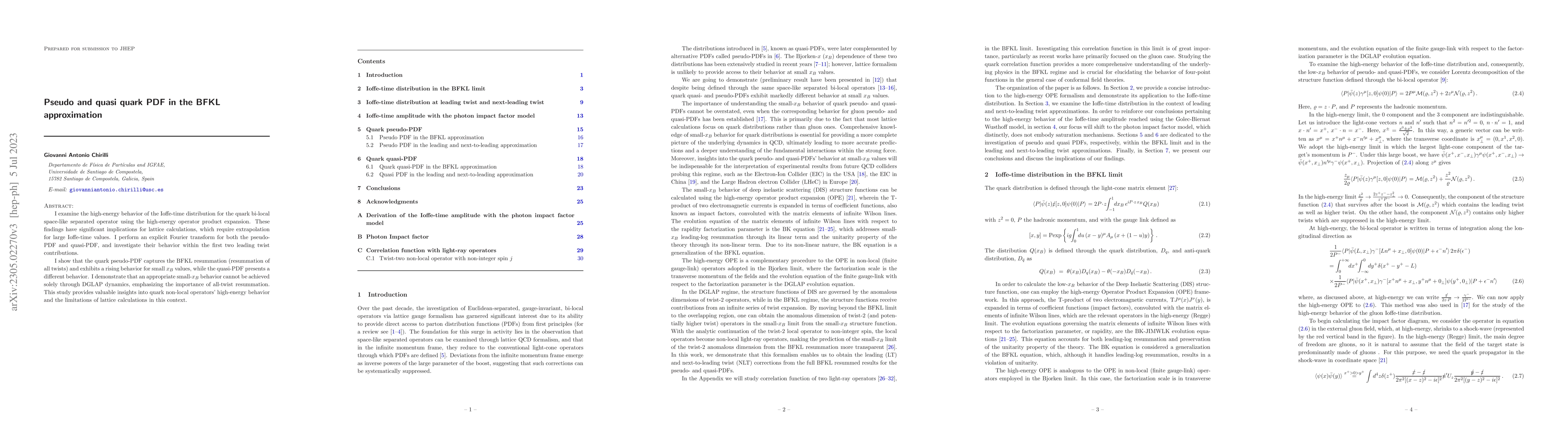 This paper investigates the high-energy behavior of quark bi-local operators using the BFKL approximation, showing that the pseudo-PDF captures BFKL resummation and rises for small $x_B$, while the quasi-PDF behaves differently. It highlights the limitations of lattice calculations without all-twist resummation.