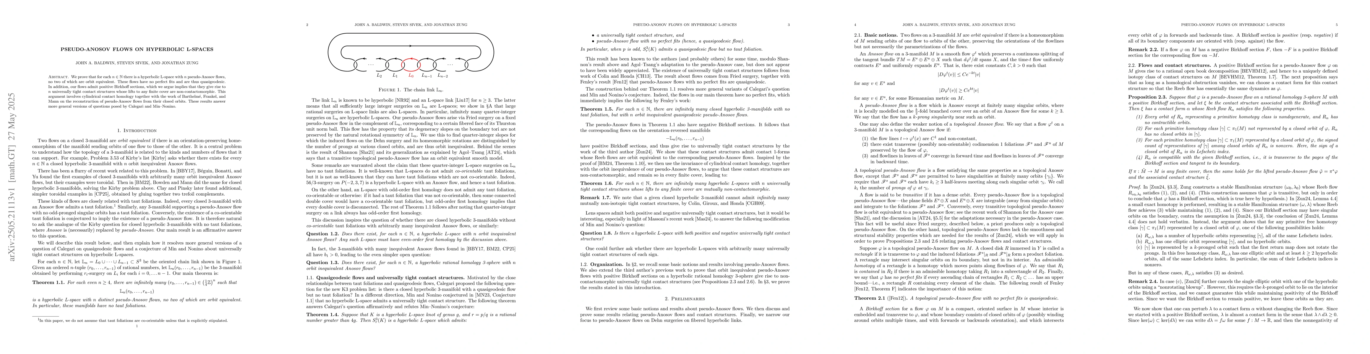Researchers prove the existence of hyperbolic L-spaces with n pseudo-Anosov flows that cannot be orbit equivalent to each other, giving rise to universally tight contact structures.
