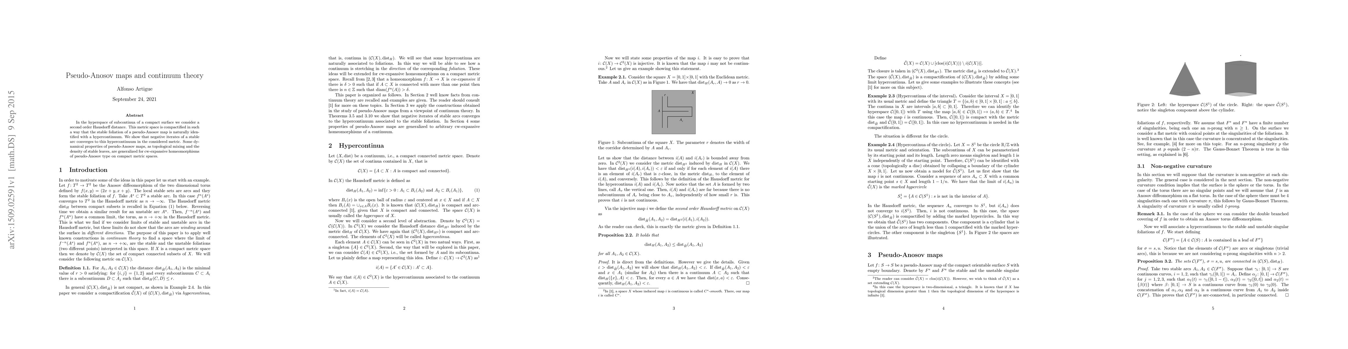 In the hyperspace of subcontinua of a compact surface we consider a second order Hausdorff distance. This metric space is compactified in such a way that the stable foliation of a pseudo-Anosov map is naturally identified with a hypercontinuum. We show that negative iterates of a stable arc converges to this hypercontinuum in the considered metric. Some dynamical properties of pseudo-Anosov maps, as topological mixing and the density of stable leaves, are generalized for cw-expansive homeomorphisms of pseudo-Anosov type on compact metric spaces.