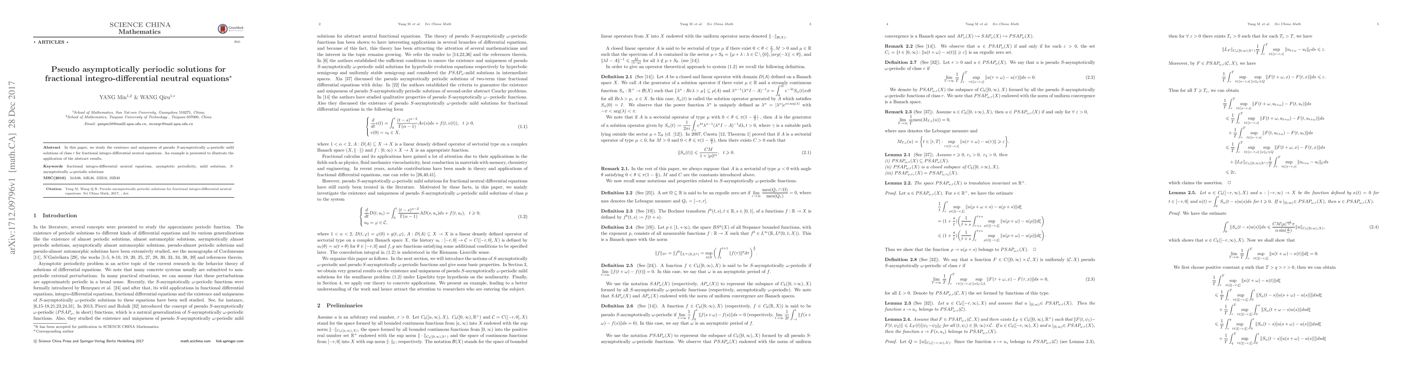 This paper explores the existence and uniqueness of pseudo $S$-asymptotically $\omega$-periodic mild solutions of class $r$ for fractional integro-differential neutral equations. An example is provided to demonstrate the practical application of the theoretical findings.