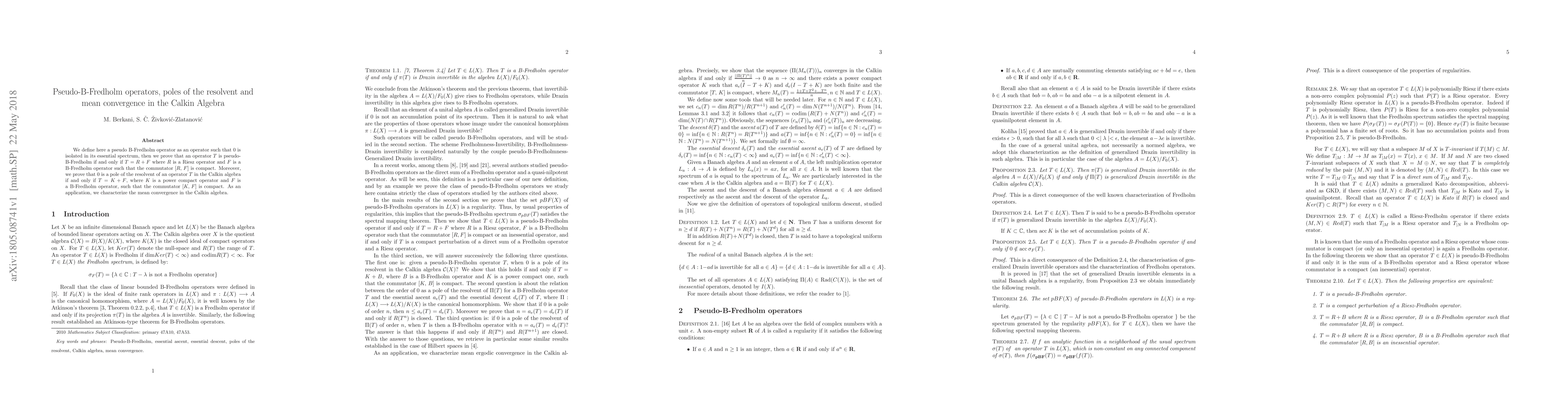 We define here a pseudo B-Fredholm operator as an operator such that 0 is isolated in its essential spectrum, then we prove that an operator $T$ is pseudo- B-Fredholm if and only if $T = R + F$ where $R$ is a Riesz operator and $F$ is a B-Fredholm operator such that the commutator $[R,\, F]$ is compact. Moreover, we prove that 0 is a pole of the resolvent of an operator $T$ in the Calkin algebra if and only if $T= K+F$, where $K$ is a power compact operator and $F$ is a B-Fredholm operator, such that the commutator $[K,\, F]$ is compact. As an application, we characterize the mean convergence in the Calkin algebra.