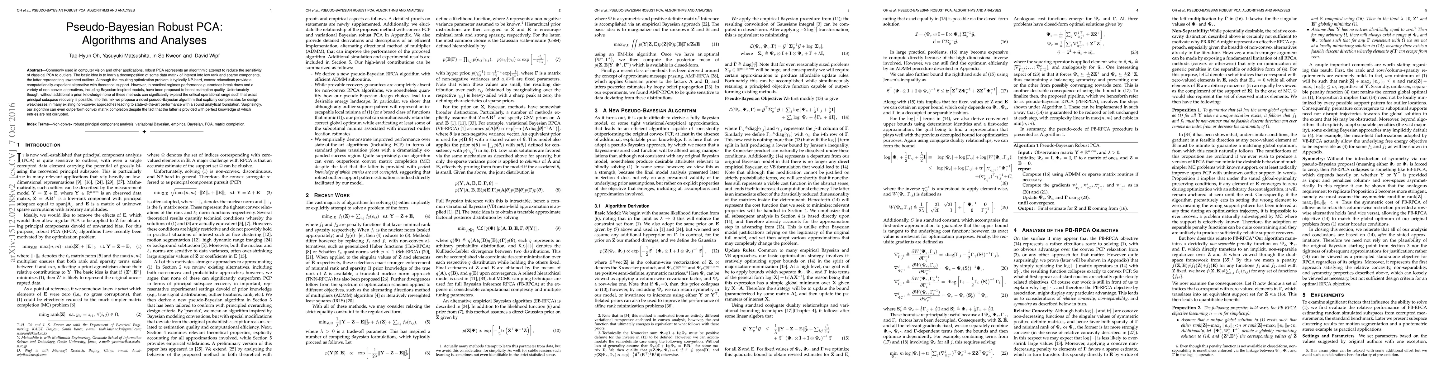 The paper proposes a novel pseudo-Bayesian algorithm for robust PCA, which compensates for design weaknesses in existing non-convex approaches, leading to state-of-the-art performance with a sound analytical foundation.