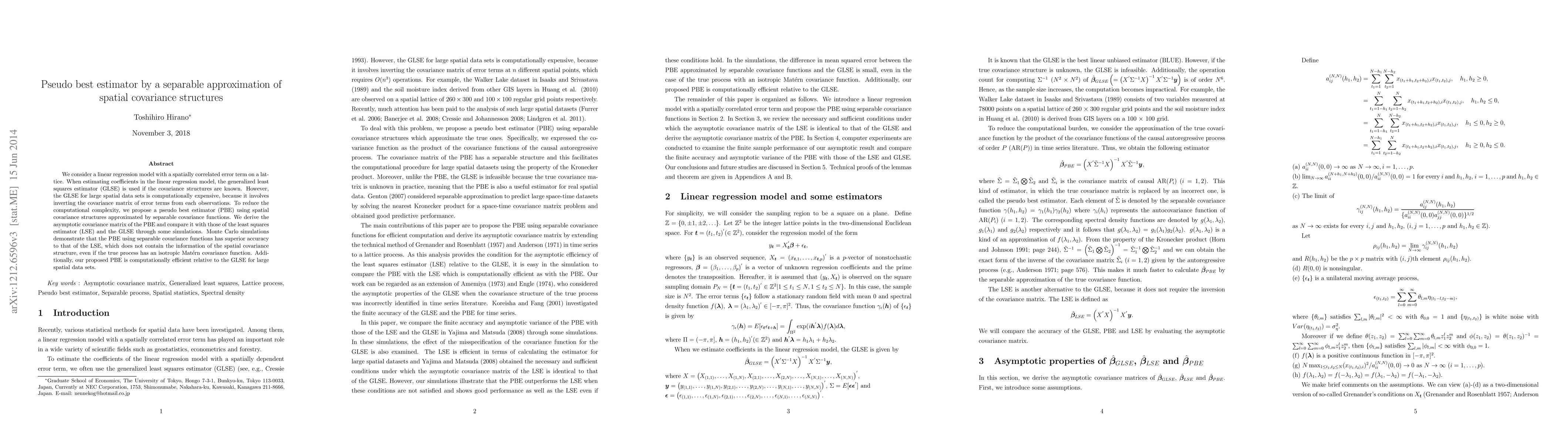 We consider a linear regression model with a spatially correlated error term on a lattice. When estimating coefficients in the linear regression model, the generalized least squares estimator (GLSE) is used if the covariance structures are known. However, the GLSE for large spatial data sets is computationally expensive, because it involves inverting the covariance matrix of error terms from each observations. To reduce the computational complexity, we propose a pseudo best estimator (PBE) using spatial covariance structures approximated by separable covariance functions. We derive the asymptotic covariance matrix of the PBE and compare it with those of the least squares estimator (LSE) and the GLSE through some simulations. Monte Carlo simulations demonstrate that the PBE using separable covariance functions has superior accuracy to that of the LSE, which does not contain the information of the spatial covariance structure, even if the true process has an isotropic Mat\'ern covariance function. Additionally, our proposed PBE is computationally efficient relative to the GLSE for large spatial data sets.