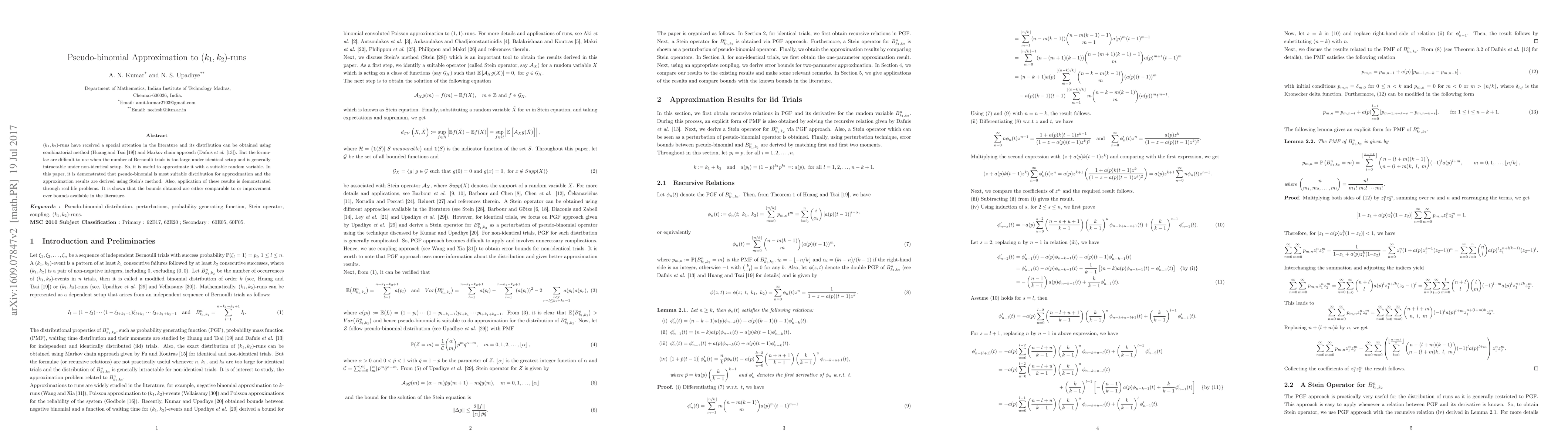 ($k_1,k_2$)-runs have received a special attention in the literature and its distribution can be obtained using combinatorial method (Huang and Tsai) and Markov chain approach (Dafnis et al). But the formulae are difficult to use when the number of Bernoulli trials is too large under identical setup and is generally intractable under non-identical setup. So, it is useful to approximate it with a suitable random variable. In this paper, it is demonstrated that pseudo-binomial is most suitable distribution for approximation and the approximation results are derived using Stein's method. Also, application of these results is demonstrated through real-life problems. It is shown that the bounds obtained are either comparable to or improvement over bounds available in the literature.
