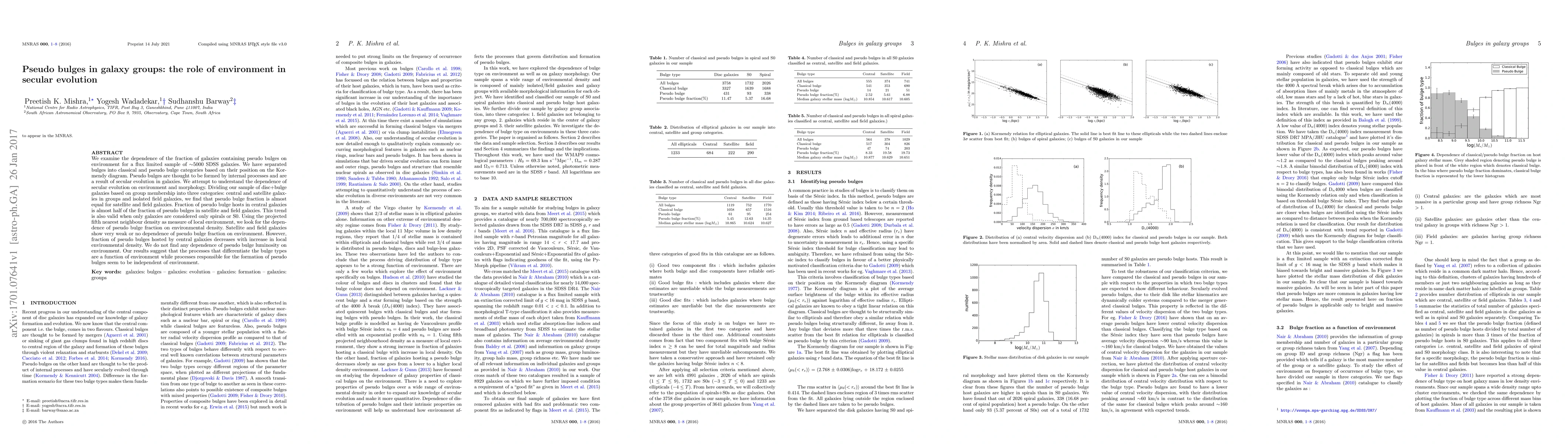 We examine the dependence of the fraction of galaxies containing pseudo bulges on environment for a flux limited sample of $\sim$5000 SDSS galaxies. We have separated bulges into classical and pseudo bulge categories based on their position on the Kormendy diagram. Pseudo bulges are thought to be formed by internal processes and are a result of secular evolution in galaxies. We attempt to understand the dependence of secular evolution on environment and morphology. Dividing our sample of disc+bulge galaxies based on group membership into three categories: central and satellite galaxies in groups and isolated field galaxies, we find that pseudo bulge fraction is almost equal for satellite and field galaxies. Fraction of pseudo bulge hosts in central galaxies is almost half of the fraction of pseudo bulges in satellite and field galaxies. This trend is also valid when only galaxies are considered only spirals or S0. Using the projected fifth nearest neighbour density as measure of local environment, we look for the dependence of pseudo bulge fraction on environmental density. Satellite and field galaxies show very weak or no dependence of pseudo bulge fraction on environment. However, fraction of pseudo bulges hosted by central galaxies decreases with increase in local environmental density. We do not find any dependence of pseudo bulge luminosity on environment. Our results suggest that the processes that differentiate the bulge types are a function of environment while processes responsible for the formation of pseudo bulges seem to be independent of environment.