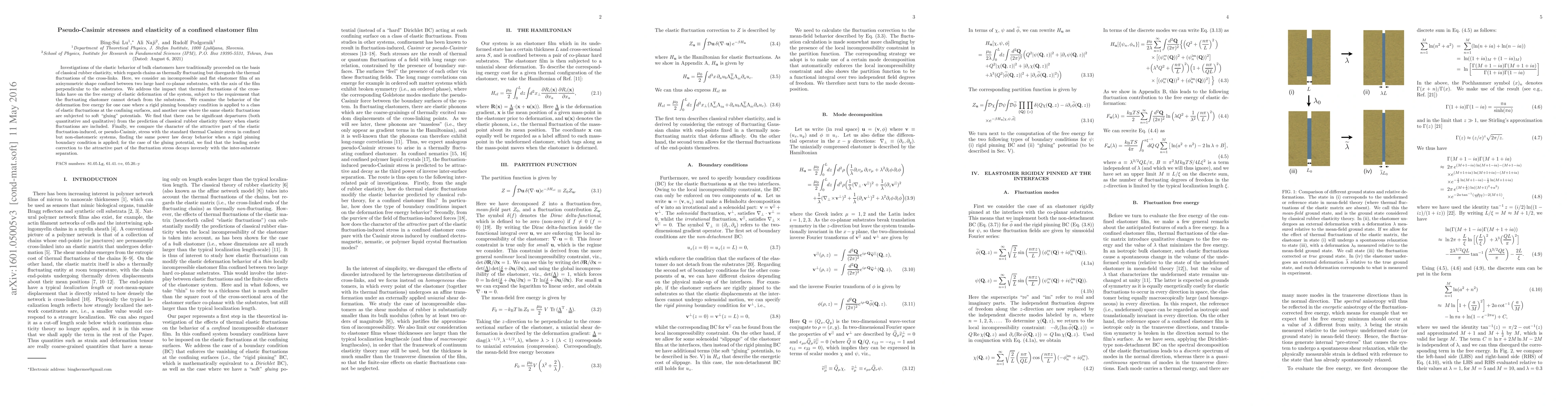 Investigations of the elastic behavior of bulk elastomers have traditionally proceeded on the basis of classical rubber elasticity, which regards chains as thermally fluctuating but disregards the thermal fluctuations of the cross-links. Here, we consider an incompressible and flat elastomer film of an axisymmetric shape confined between two large hard co-planar substrates, with the axis of the film perpendicular to the substrates. We address the impact that thermal fluctuations of the cross-links have on the free energy of elastic deformation of the system, subject to the requirement that the fluctuating elastomer cannot detach from the substrates. We examine the behavior of the deformation free energy for one case where a rigid pinning boundary condition is applied to a class of elastic fluctuations at the confining surfaces, and another case where the same elastic fluctuations are subjected to soft "gluing" potentials. We find that there can be significant departures (both quantitative and qualitative) from the prediction of classical rubber elasticity theory when elastic fluctuations are included. Finally, we compare the character of the attractive part of the elastic fluctuation-induced, or pseudo-Casimir, stress with the standard thermal Casimir stress in confined but non-elastomeric systems, finding the same power law decay behavior when a rigid pinning boundary condition is applied, for the case of the gluing potential, we find that the leading order correction to the attractive part of the fluctuation stress decays inversely with the inter-substrate separation.