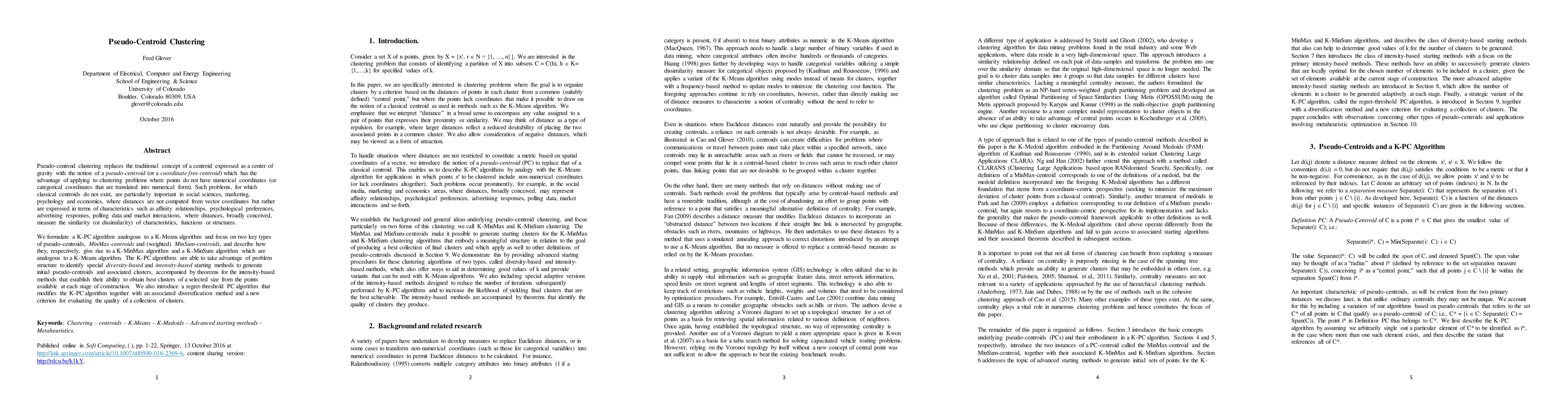 Pseudo-Centroid Clustering replaces the traditional concept of a centroid expressed as a center of gravity with the notion of a pseudo-centroid (or a coordinate free centroid) which has the advantage of applying to clustering problems where points do not have numerical coordinates (or categorical coordinates that are translated into numerical form). Such problems, for which classical centroids do not exist, are particularly important in social sciences, marketing, psychology and economics, where distances are not computed from vector coordinates but rather are expressed in terms of characteristics such as affinity relationships, psychological preferences, advertising responses, polling data, market interactions and so forth, where distances, broadly conceived, measure the similarity (or dissimilarity) of characteristics, functions or structures. We formulate a K-PC algorithm analogous to a K-Means algorithm, and identify two key types of pseudo-centroids, MinMax centroids and (weighted) MinSum centroids, and describe how they respectively give rise to a K-MinMax algorithm and a K-MinSum algorithm which are analogous to a K-Means algorithm. The K-PC algorithms are able to take advantage of problem structure to identify special diversity-based and intensity-based starting methods to generate initial pseudo-centroids and associated clusters, accompanied by theorems for the intensity-based methods that establish their ability to obtain best clusters of a selected size from the points available at each stage of construction. We also introduce a Regret-Threshold PC algorithm that modifies the K-PC algorithm together with an associated diversification method and a new criterion for evaluating the quality of a collection of clusters.