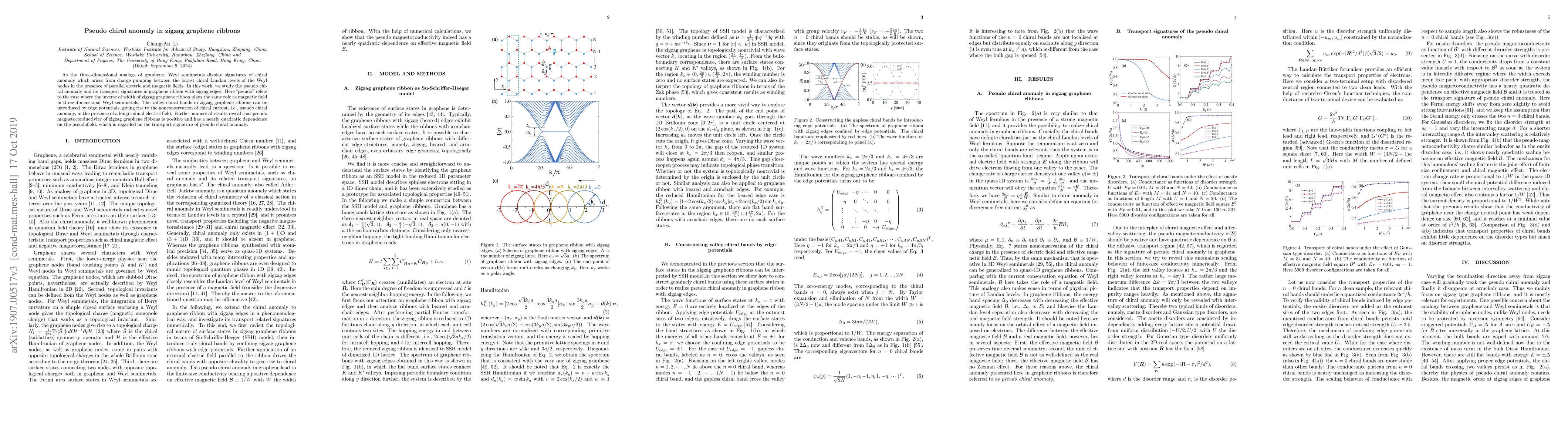 This paper investigates the pseudo chiral anomaly in zigzag graphene ribbons, demonstrating that the ribbon's width acts similarly to a magnetic field in Weyl semimetals. The study finds that valley chiral bands and edge potentials lead to nonconservation of chiral current, manifesting as a positive pseudo magnetoconductivity with a quadratic dependence on the pseudofield.