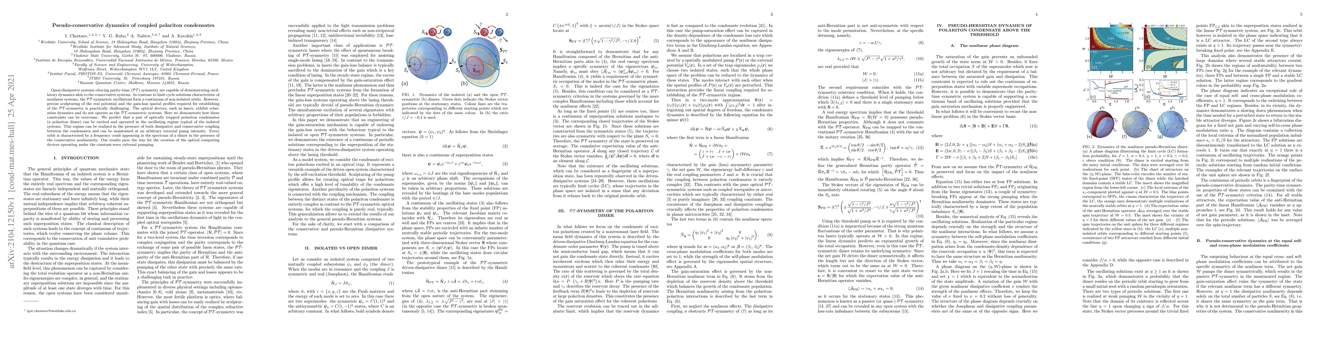 Open-dissipative systems obeying parity-time ($\mathcal{PT}$) symmetry are capable of demonstrating oscillatory dynamics akin to the conservative systems. In contrast to limit cycle solutions characteristic of nonlinear systems, the $\mathcal{PT}$-symmetric oscillations form a continuum of non-isolated orbits. However, precise sculpturing of the real potential and the gain-loss spatial profiles required for establishing of the $\mathcal{PT}$-symmetry is practically challenging. The optical devices, such as lasers, exhibit relaxation dynamics and do not operate as the $\mathcal{PT}$-symmetric systems. Here we demonstrate how these constraints can be overcome. We predict that a pair of optically trapped polariton condensates (a polariton dimer) can be excited and operated in the oscillating regime typical of the isolated systems. This regime can be realized in the presence of both dissipative and conservative coupling between the condensates and can be maintained at an arbitrary external pump intensity. Every orbit is characterised by a frequency comb appearing in the spectrum of a dimer in the presence of the conservative nonlinearity. Our results pave the way for the creation of the optical computing devices operating under the constant-wave external pumping.