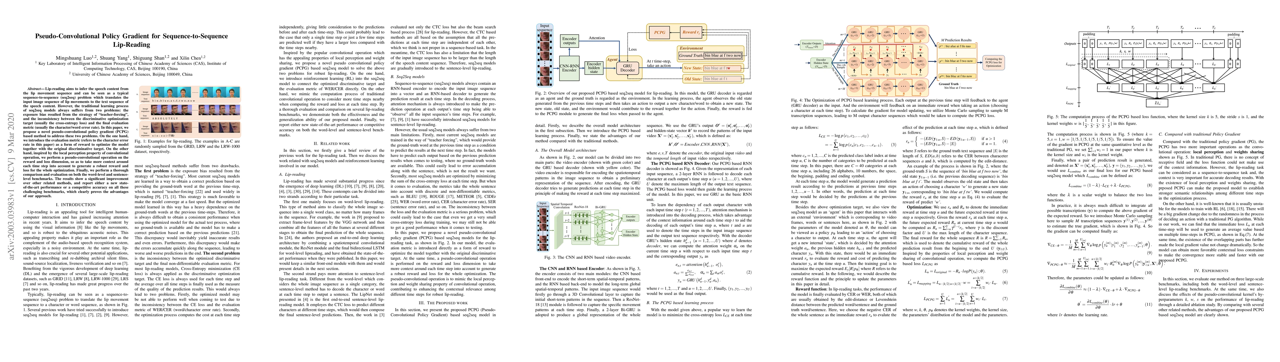 This paper proposes a pseudo-convolutional policy gradient (PCPG) method to improve sequence-to-sequence lip-reading models, addressing exposure bias and mismatch between training and evaluation metrics. The approach integrates character error rate as a reward to optimize the model, enhancing context consideration through pseudo-convolutional operations.