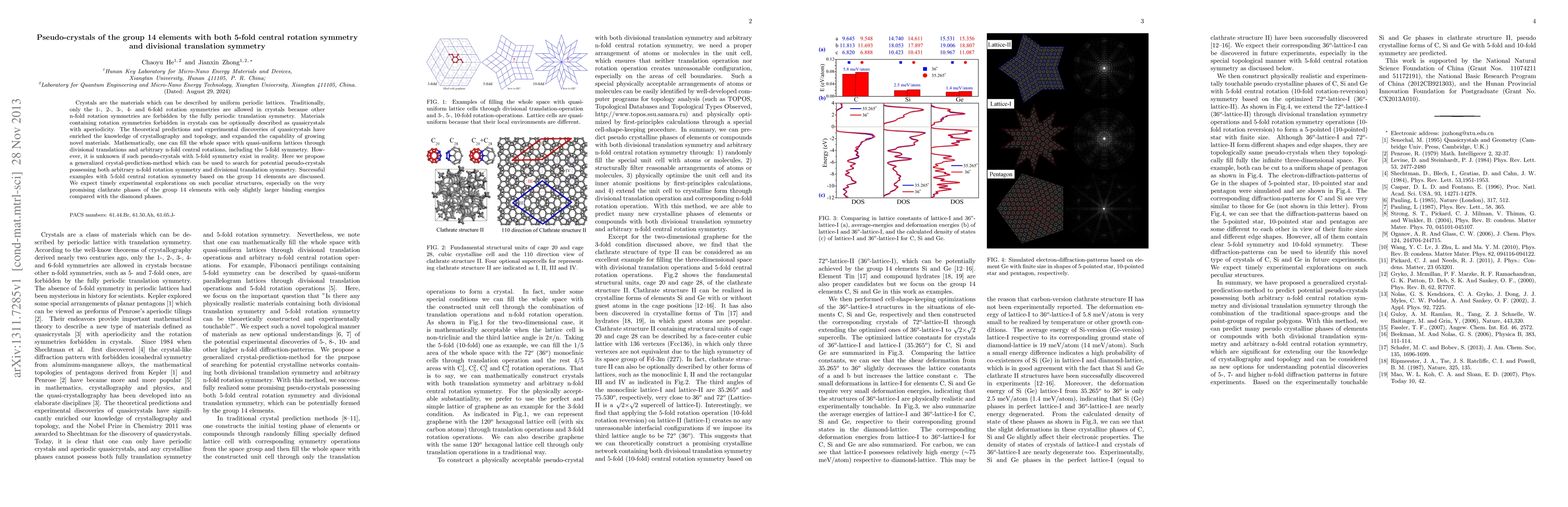 Crystals are the materials which can be described by uniform periodic lattices. Traditionally, only the 1-, 2-, 3-, 4- and 6-fold rotation symmetries are allowed in crystals because other n-fold rotation symmetries are forbidden by the fully periodic translation symmetry. Materials containing rotation symmetries forbidden in crystals can be optionally described as quasicrystals with aperiodicity. The theoretical predictions and experimental discoveries of quasicrystals have enriched the knowledge of crystallography and topology, and expanded the capability of growing novel materials. Mathematically, one can fill the whole space with quasi-uniform lattices through divisional translations and arbitrary n-fold central rotations, including the 5-fold symmetry. However, it is unknown if such pseudo-crystals with 5-fold symmetry exist in reality. Here we propose a generalized crystal-prediction-method which can be used to search for potential pseudo-crystals possessing both arbitrary n-fold rotation symmetry and divisional translation symmetry. Successful examples with 5-fold central rotation symmetry based on the group 14 elements are discussed. We expect timely experimental explorations on such peculiar structures, especially on the very promising clathrate phases of the group 14 elements with only slightly larger binding energies compared with the diamond phases.