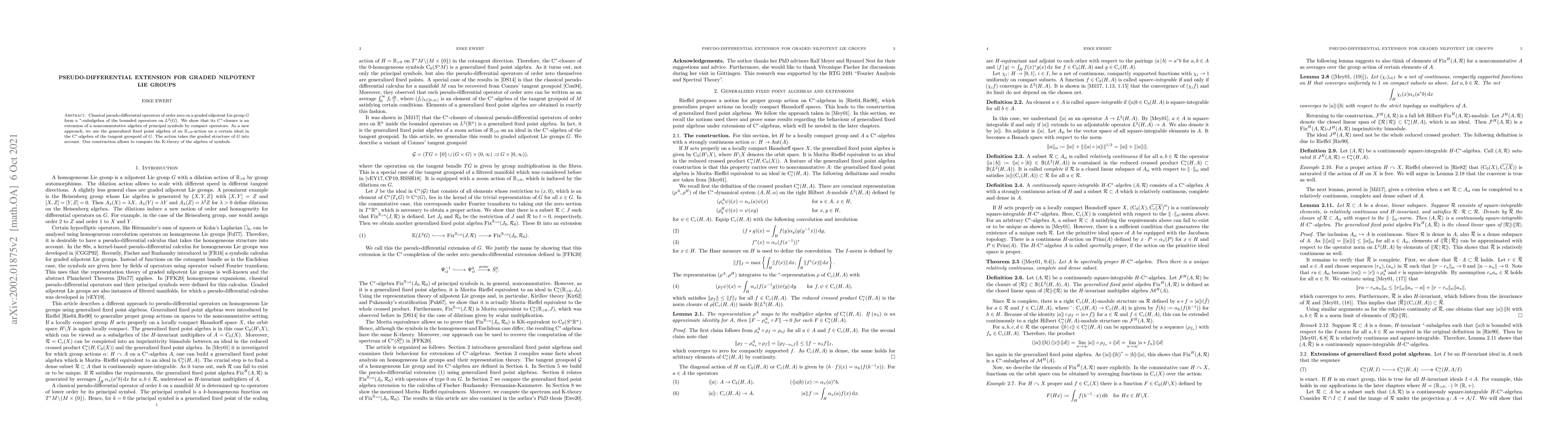 This paper extends classical pseudo-differential operators to graded nilpotent Lie groups, showing their $C^*$-closure forms an extension of a noncommutative algebra of principal symbols by compact operators. The authors utilize the generalized fixed point algebra of an $\mathbb{R}_{>0}$-action to account for the graded structure, enabling the computation of the algebra's $K$-theory.