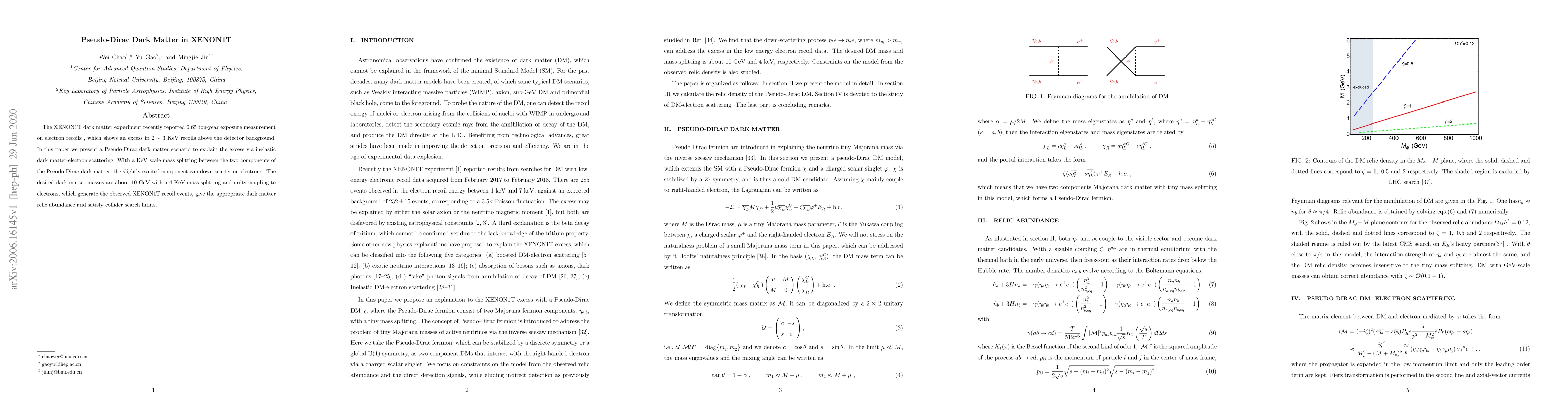 This paper proposes a Pseudo-Dirac dark matter model to explain the XENON1T electron recoil excess in the 2-3 keV range, suggesting that a small mass splitting allows for inelastic scattering with electrons. The model features 10 GeV dark matter masses with a 4 keV splitting and unity coupling, satisfying observed recoils, relic abundance, and collider constraints.