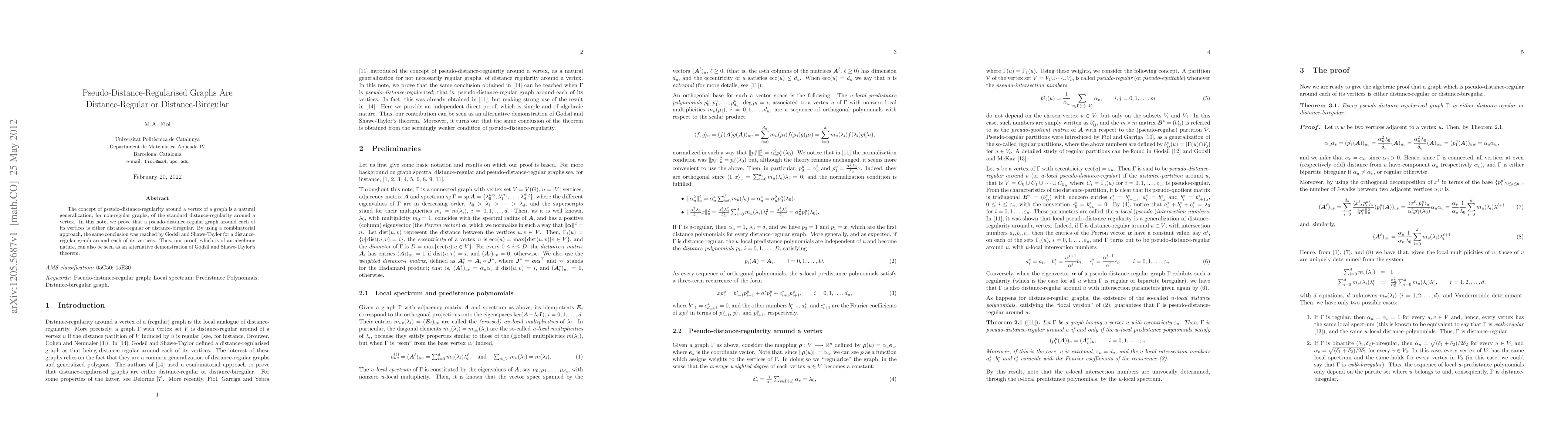This paper proves that a pseudo-distance-regular graph is either distance-regular or distance-biregular. The proof uses an algebraic approach, offering an alternative to Godsil and Shawe-Taylor's combinatorial demonstration for distance-regular graphs.