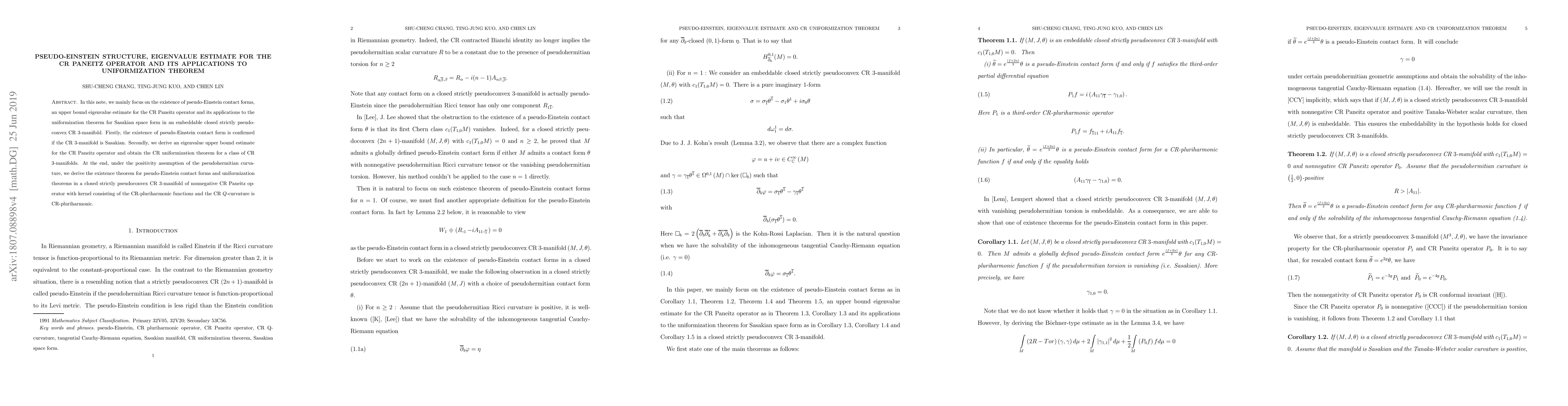 This research confirms the existence of pseudo-Einstein contact forms on Sasakian manifolds and provides an upper bound for the CR Paneitz operator's eigenvalues. It applies these findings to prove a uniformization theorem for specific classes of CR 3-manifolds, especially those with nonnegative CR Paneitz operators.