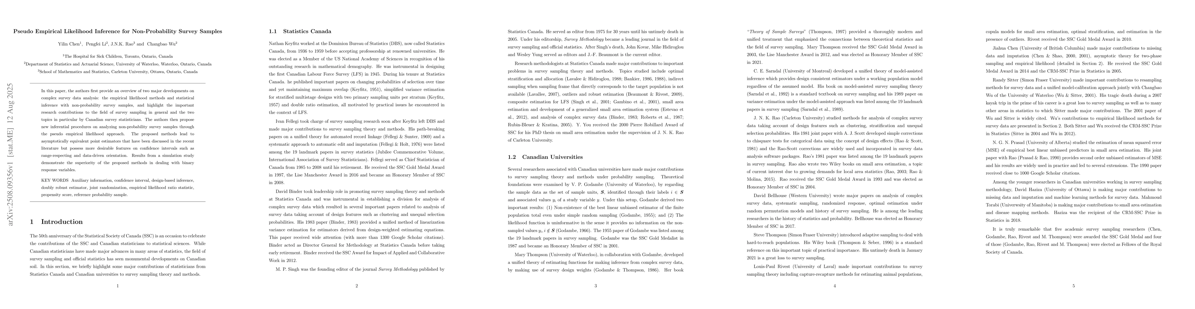 In this paper, the authors first provide an overview of two major developments on complex survey data analysis: the empirical likelihood methods and statistical inference with non-probability survey samples, and highlight the important research contributions to the field of survey sampling in general and the two topics in particular by Canadian survey statisticians. The authors then propose new inferential procedures on analyzing non-probability survey samples through the pseudo empirical likelihood approach. The proposed methods lead to asymptotically equivalent point estimators that have been discussed in the recent literature but possess more desirable features on confidence intervals such as range-respecting and data-driven orientation. Results from a simulation study demonstrate the superiority of the proposed methods in dealing with binary response variables.