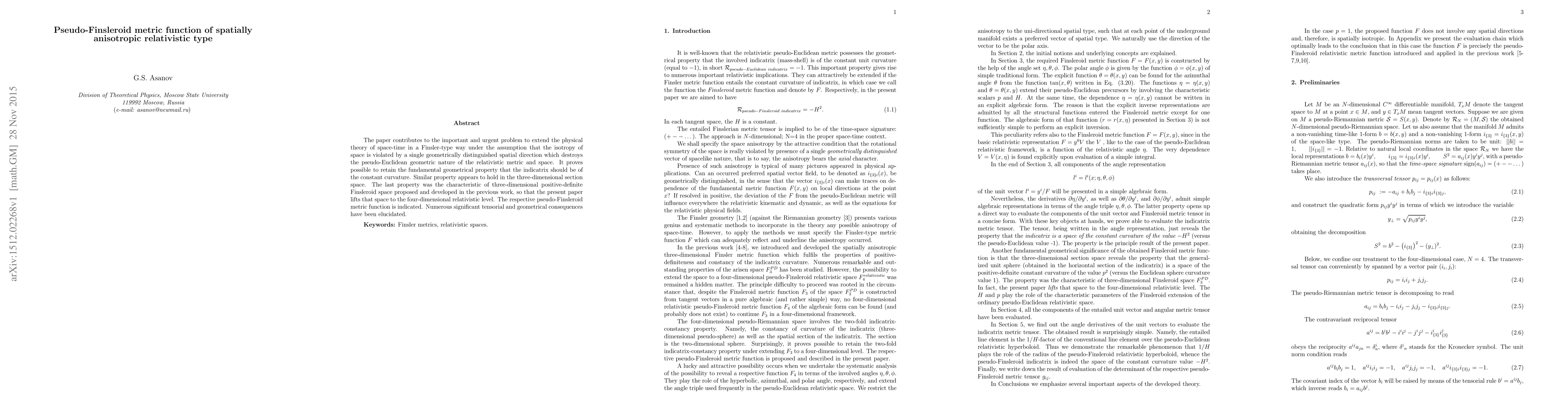 This research introduces a pseudo-Finsleroid metric function for a spatially anisotropic relativistic space, preserving constant curvature of the indicatrix and extending a three-dimensional positive-definite Finsleroid space to four dimensions. It explores significant tensorial and geometrical consequences.