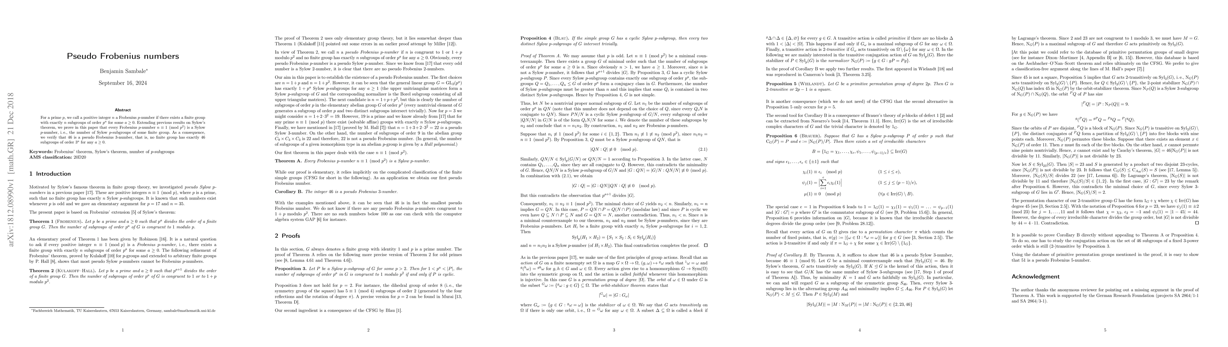 For a prime p, we call a positive integer n a Frobenius p-number if there exists a finite group with exactly n subgroups of order p^a for some $a\ge 0$. Extending previous results on Sylow's theorem, we prove in this paper that every Frobenius p-number $n\equiv 1\pmod{p^2}$ is a Sylow p-number, i.e., the number of Sylow p-subgroups of some finite group. As a consequence, we verify that 46 is a pseudo Frobenius 3-number, that is, no finite group has exactly 46 subgroups of order 3^a for any $a\ge 0$.