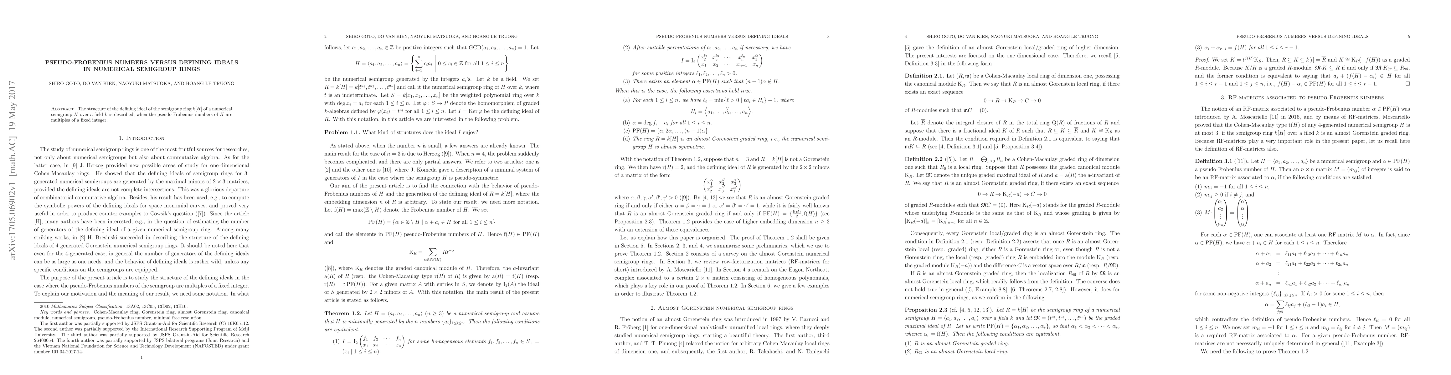 The structure of the defining ideal of the semigroup ring $k[H]$ of a numerical semigroup $H$ over a field $k$ is described, when the pseudo-Frobenius numbers of $H$ are multiples of a fixed integer.