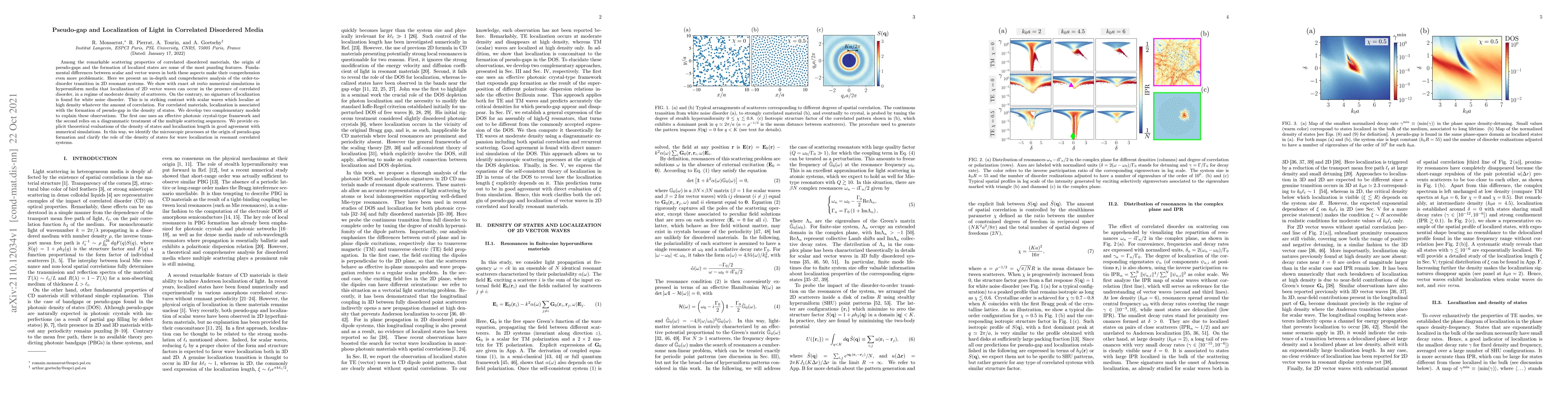 Among the remarkable scattering properties of correlated disordered materials, the origin of pseudo-gaps and the formation of localized states are some of the most puzzling features. Fundamental differences between scalar and vector waves in both these aspects make their comprehension even more problematic. Here we present an in-depth and comprehensive analysis of the order-to-disorder transition in 2D resonant systems. We show with exact ab initio numerical simulations in hyperuniform media that localization of 2D vector waves can occur in the presence of correlated disorder, in a regime of moderate density of scatterers. On the contrary, no signature of localization is found for white noise disorder. This is in striking contrast with scalar waves which localize at high density whatever the amount of correlation. For correlated materials, localization is associated with the formation of pseudo-gap in the density of states. We develop two complementary models to explain these observations. The first one uses an effective photonic crystal-type framework and the second relies on a diagrammatic treatment of the multiple scattering sequences. We provide explicit theoretical evaluations of the density of states and localization length in good agreement with numerical simulations. In this way, we identify the microscopic processes at the origin of pseudo-gap formation and clarify the role of the density of states for wave localization in resonant correlated systems.