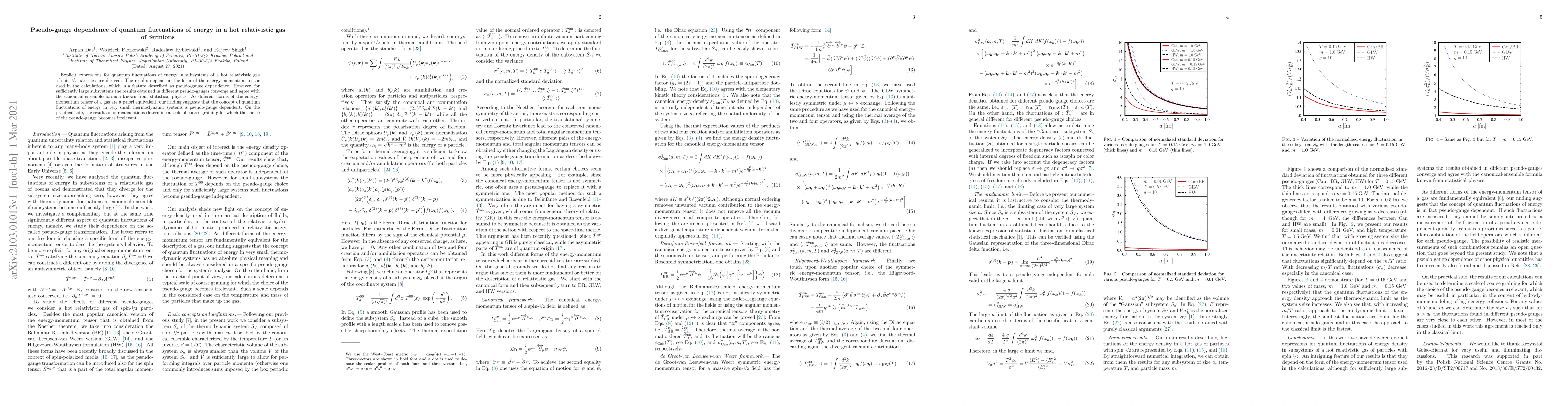 Explicit expressions for quantum fluctuations of energy in subsystems of a hot relativistic gas of spin-$1/2$ particles are derived. The results depend on the form of the energy-momentum tensor used in the calculations, which is a feature described as pseudo-gauge dependence. However, for sufficiently large subsystems the results obtained in different pseudo-gauges converge and agree with the canonical-ensemble formula known from statistical physics. As different forms of the energy-momentum tensor of a gas are a priori equivalent, our finding suggests that the concept of quantum fluctuations of energy in very small thermodynamic systems is pseudo-gauge dependent. On the practical side, the results of our calculations determine a scale of coarse graining for which the choice of the pseudo-gauge becomes irrelevant.