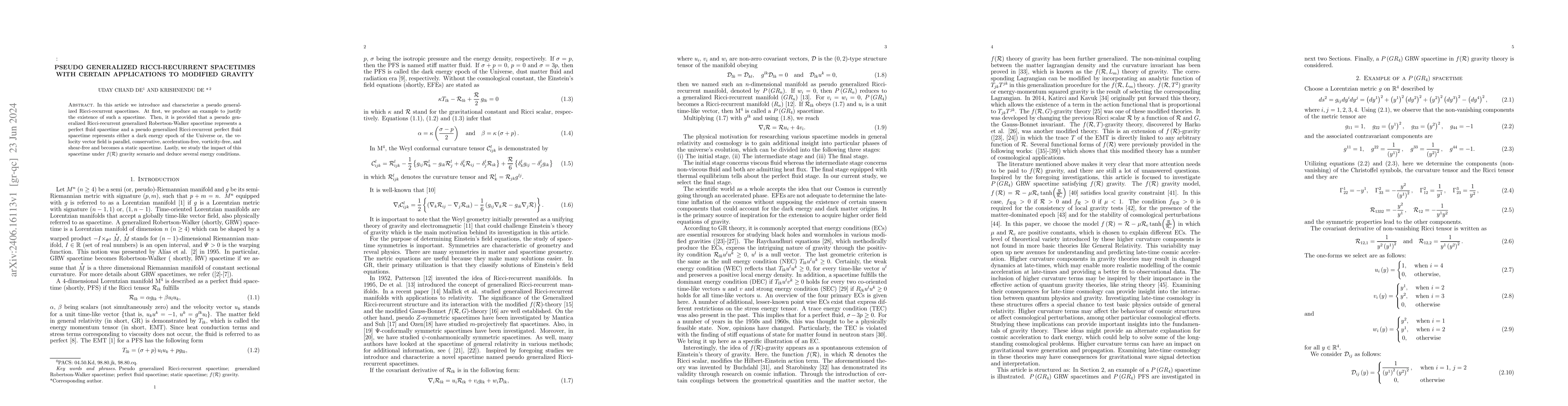 This paper introduces pseudo generalized Ricci-recurrent spacetimes, providing an example and demonstrating their application in modified gravity, specifically $f(\mathcal{R})$ gravity. It concludes that these spacetimes represent either perfect fluid or dark energy models, and deduces several energy conditions.