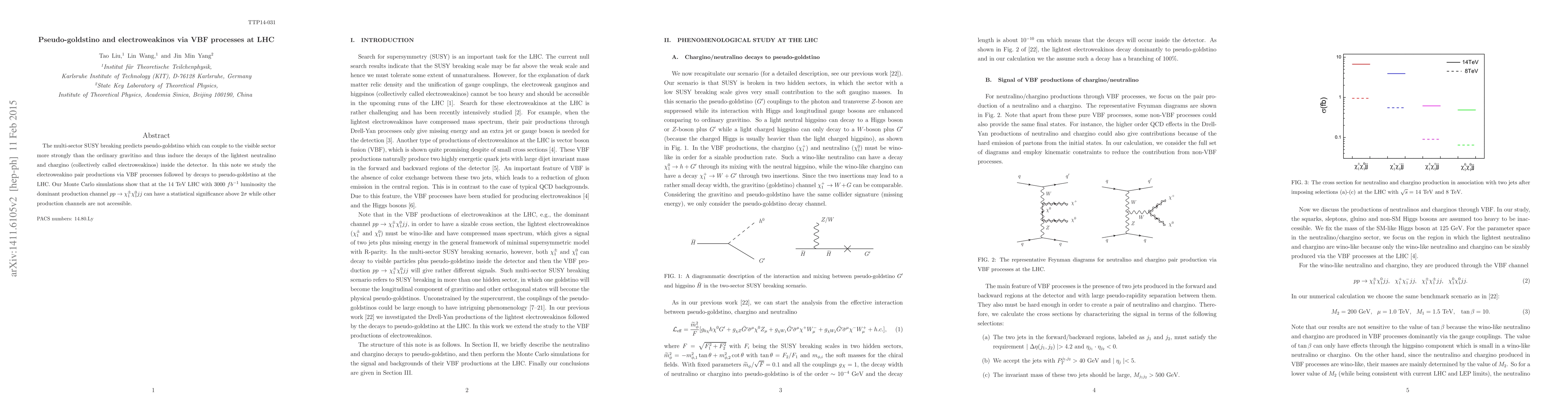The multi-sector SUSY breaking predicts pseudo-goldstino which can couple to the visible sector more strongly than the ordinary gavitino and thus induce the decays of the lightest neutralino and chargino (collectively called electroweakinos) inside the detector. In this note we study the electroweakino pair productions via vector boson fusion (VBF) processes followed by decays to pseudo-goldstino at the LHC. Our Monte Carlo simulations show that at the 14 TeV LHC with 3000 fb^{-1} luminosity the dominant production channel pp->chargino+neutralino+2 jets can have a statistical significance above 2-sigma while other production channels are not accessible.