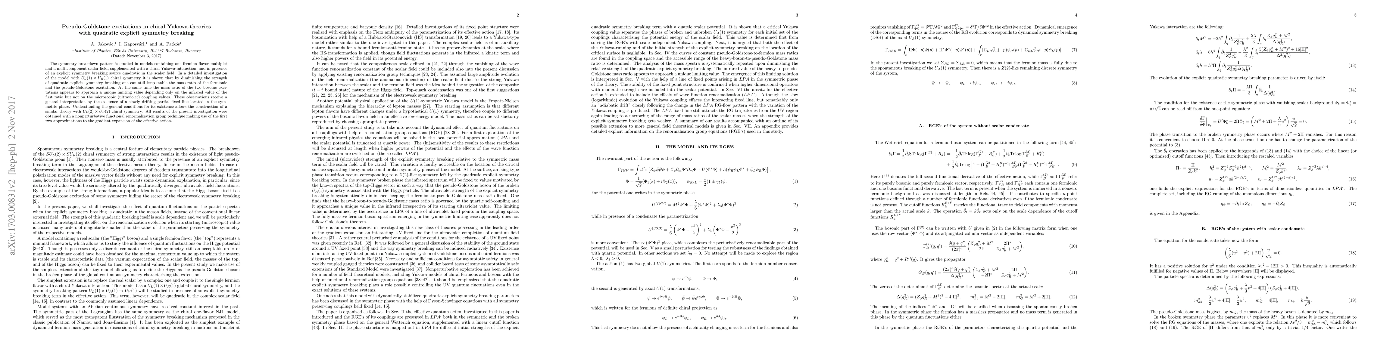 The symmetry breakdown pattern is studied in models containing one fermion flavor multiplet and a multicomponent scalar field, supplemented with a chiral Yukawa-interaction, and in presence of an explicit symmetry breaking source quadratic in the scalar field. In a detailed investigation of the model with $U_L(1) \times U_R(1)$ chiral symmetry it is shown that by diminishing the strength of quadratic explicit symmetry breaking one can still keep stable the mass ratio of the fermionic and the pseudo-Goldstone excitation. At the same time the mass ratio of the two bosonic excitations appears to approach a limiting value depending only on the infrared value of the first ratio, but not on the microscopic (ultraviolet) coupling values. The observations receive a general interpretation by the existence of an ultraviolet fixed point located in the symmetric phase. Understanding the general conditions for its existence allows the construction of a similar theory with $U_L(2) \times U_R(2)$ chiral symmetry. All results of the present investigation were obtained with nonperturbative functional renormalisation group technique making use of the first two approximations to the gradient expansion of the effective action.