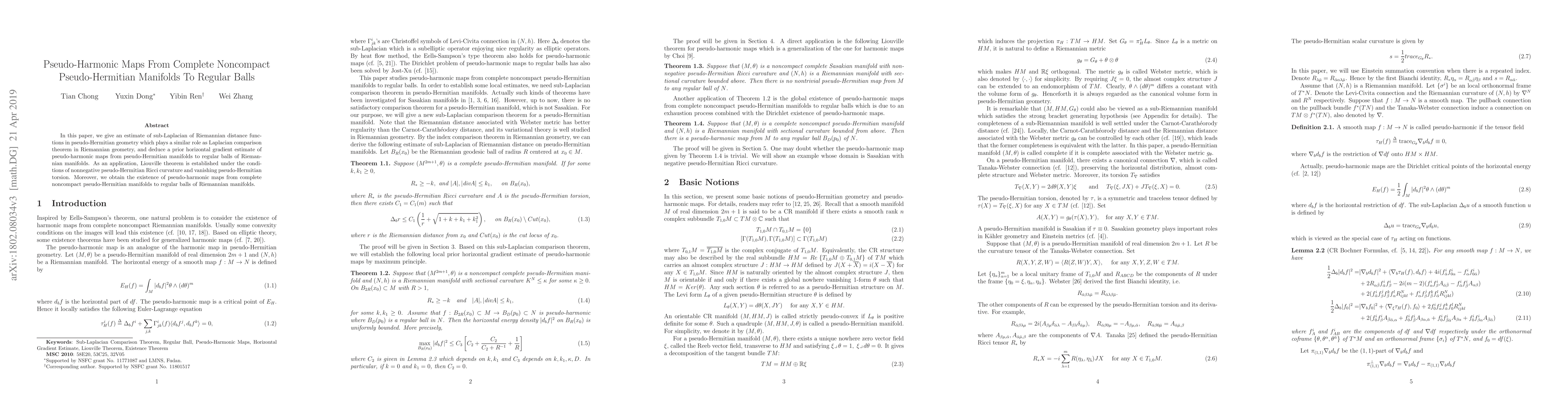 This paper establishes a sub-Laplacian estimate in pseudo-Hermitian geometry and derives a horizontal gradient estimate for pseudo-harmonic maps to regular balls. It applies these results to prove a Liouville theorem and demonstrate the existence of pseudo-harmonic maps under specified curvature and torsion conditions.