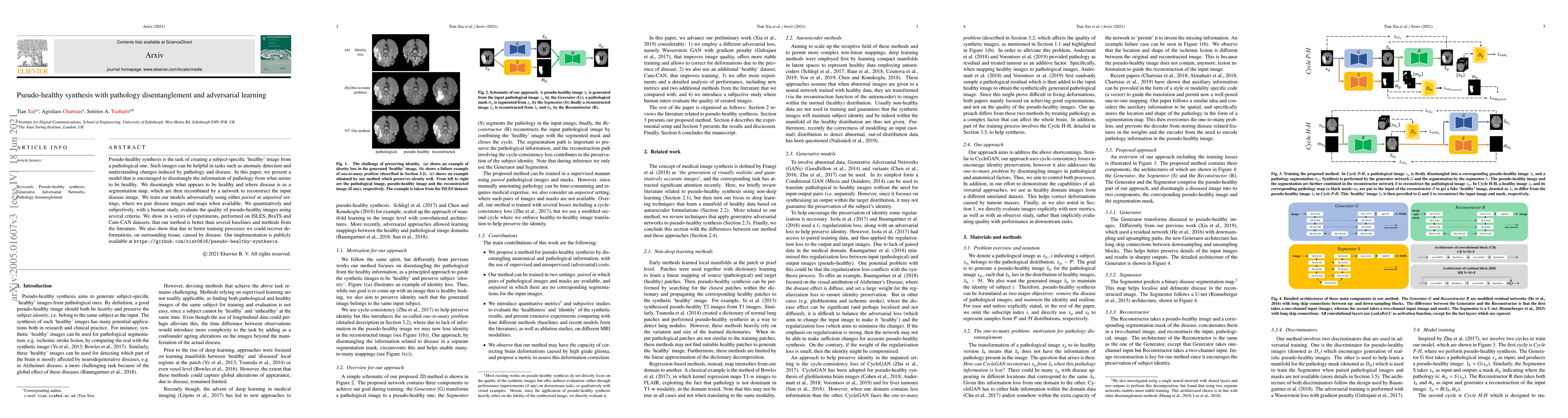 Pseudo-healthy synthesis is the task of creating a subject-specific `healthy' image from a pathological one. Such images can be helpful in tasks such as anomaly detection and understanding changes induced by pathology and disease. In this paper, we present a model that is encouraged to disentangle the information of pathology from what seems to be healthy. We disentangle what appears to be healthy and where disease is as a segmentation map, which are then recombined by a network to reconstruct the input disease image. We train our models adversarially using either paired or unpaired settings, where we pair disease images and maps when available. We quantitatively and subjectively, with a human study, evaluate the quality of pseudo-healthy images using several criteria. We show in a series of experiments, performed on ISLES, BraTS and Cam-CAN datasets, that our method is better than several baselines and methods from the literature. We also show that due to better training processes we could recover deformations, on surrounding tissue, caused by disease. Our implementation is publicly available at https://github.com/xiat0616/pseudo-healthy-synthesis. This paper has been accepted by Medical Image Analysis: https://doi.org/10.1016/j.media.2020.101719.